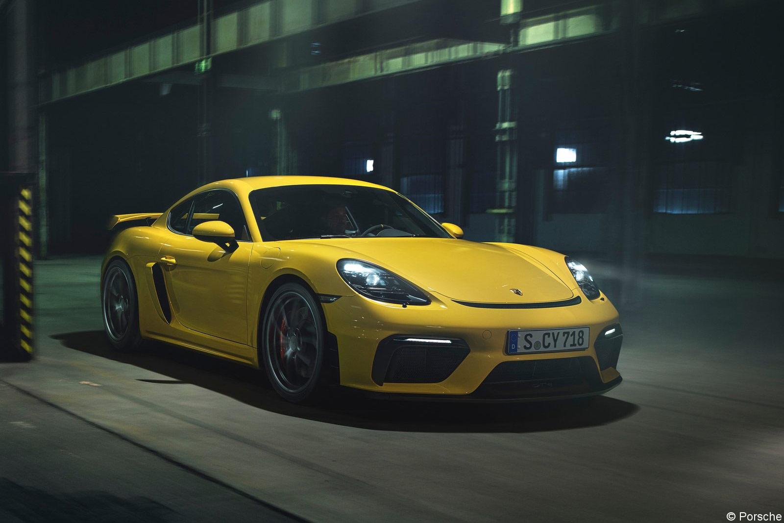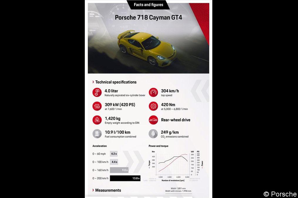 {1}Gemeinsames Herzstück beider Modelle ist der neue Vierliter-Sechszylinder-Boxer. Der Saugmotor basiert auf der gleichen Motorenfamilie wie die Turbo-Triebwerke der aktuellen 911 Carrera-Baureihe. Das neue Hochdrehzahl-Aggregat leistet 309 kW (420 PS) – 35 PS mehr als im GT4-Vorgängermodell. Die dritte Generation des Spyder legt sogar um 45 PS zu. Das maximale Drehmoment von 420 Newtonmeter steht von 5.000 bis 6.800/min zur Verfügung. Die handgeschalteten Sportwagen durchbrechen beide die 300-km/h-Schallmauer: Der 718 Spyder ist 301 km/h schnell, der 718 Cayman GT4 erreicht 304 km/h. Beide Modelle beschleunigen in 4,4 Sekunden aus dem Stand auf 100 km/h. Der korrelierte Kraftstoffverbrauch der Mittelmotor-Sportler gemäß NEFZ beträgt 10,9 l/100 km. Der faszinierende Charakter dieses Saugmotors vereint eine moderne Ottopartikelfilter-Abgasreinigung mit der linearen Kraftentfaltung und dem unmittelbaren Ansprechverhalten eines GT-Aggregats. Das Drehzahlmaximum ist bei 8.000 Touren erreicht. Der einzigartige Boxer-Sound ist unangetastet geblieben. Hinzugekommen sind technische Highlights wie die adaptive Zylindersteuerung. Im Teillastbetrieb unterbricht sie temporär den Einspritzvorgang an einer der beiden Zylinderbänke und senkt so den Kraftstoffbedarf.