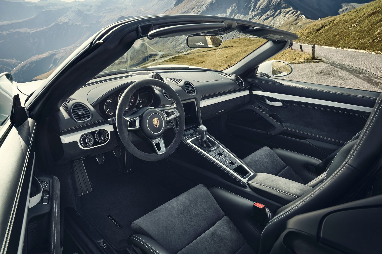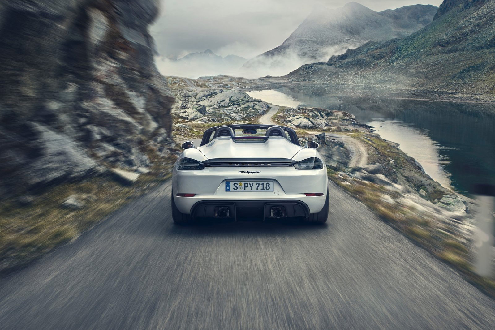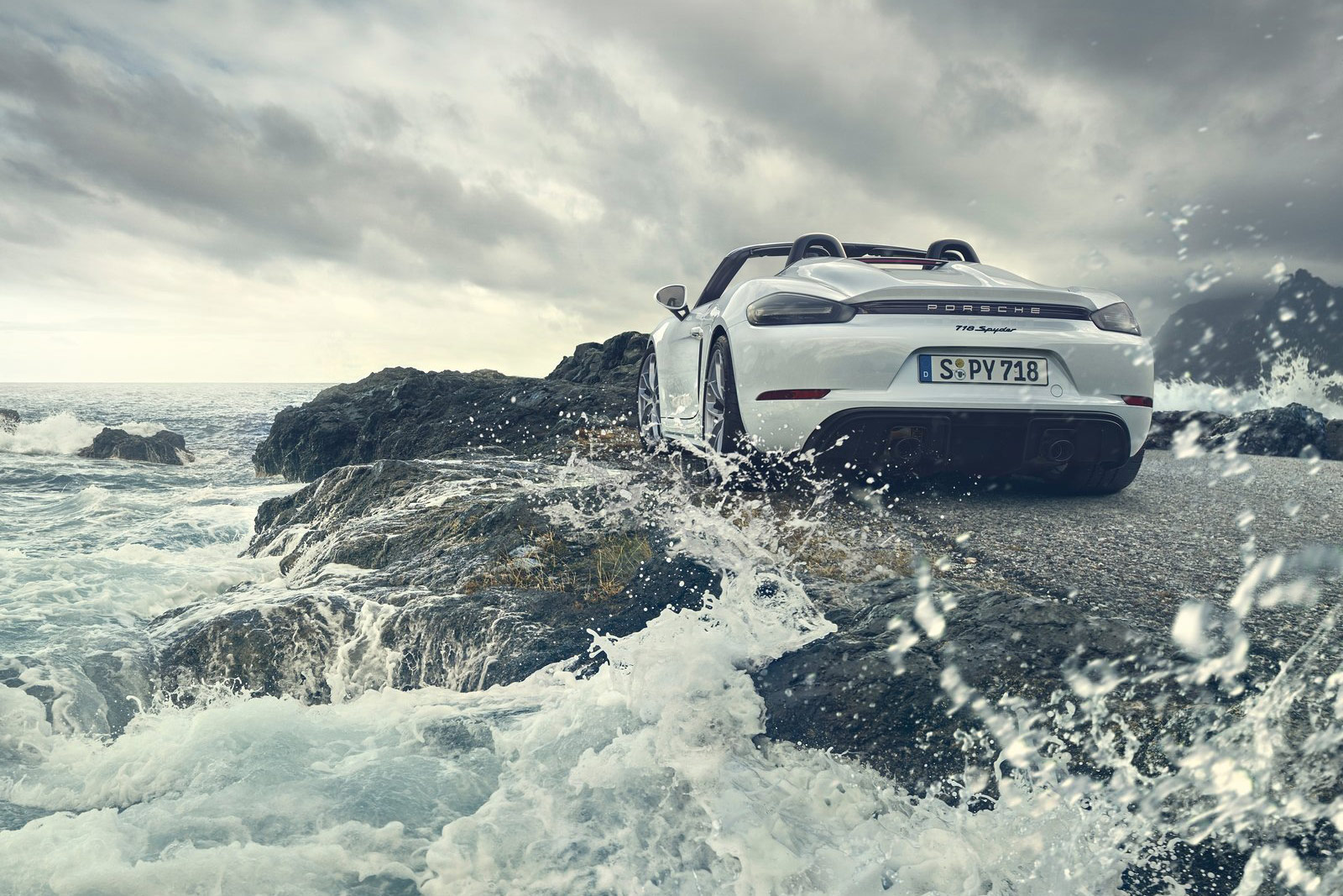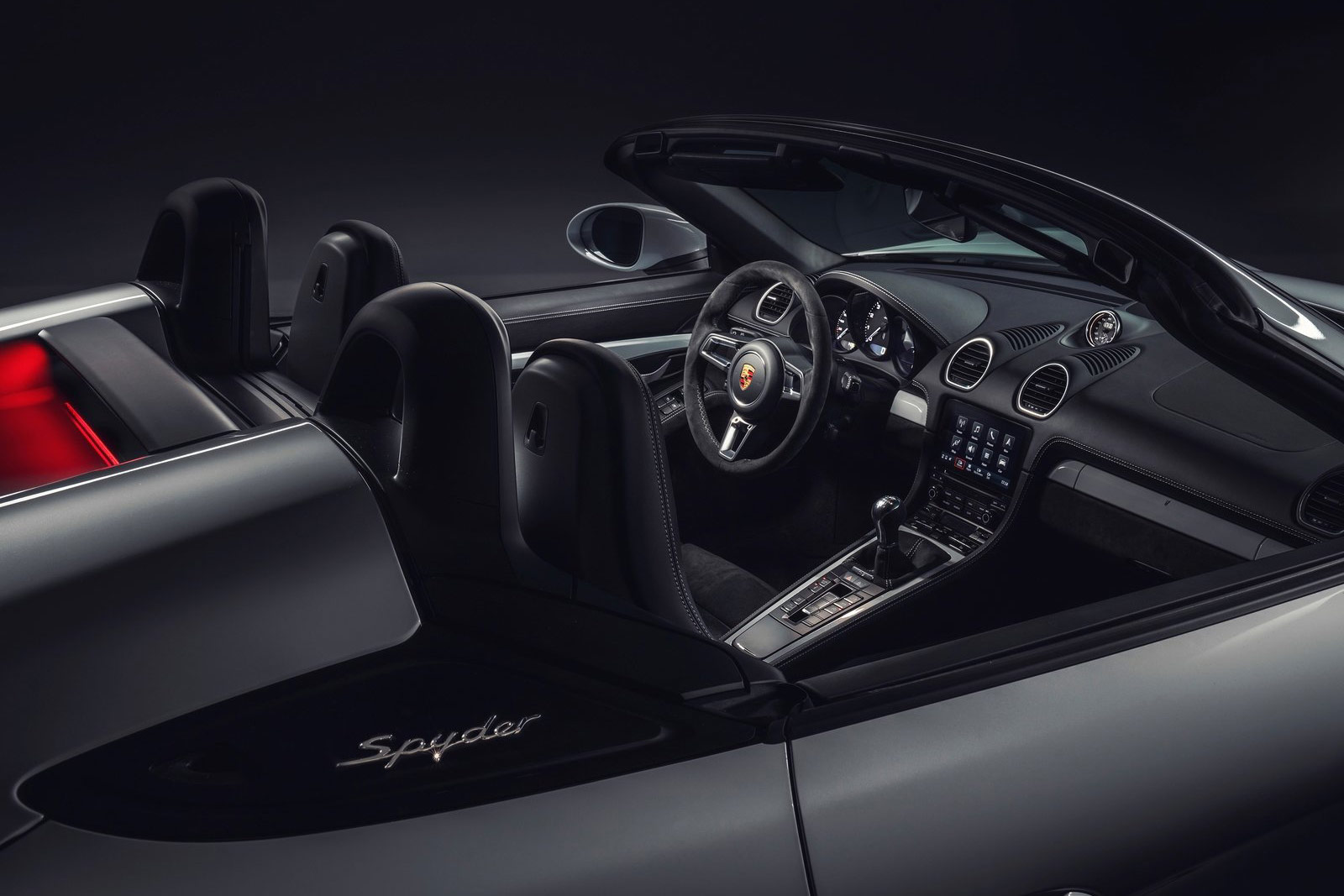 Der neue 718 Spyder ist eine puristische Fahrspaßmaschine mit hochgeschwindigkeitstauglichem Leichtbauverdeck. Er führt die Historie so berühmter Roadster wie dem Porsche 550 Spyder und dem 718 RS 60 Spyder fort. Offen wie geschlossen begeistert er mit einer faszinierenden Silhouette. Das Verdeck ist alltagstauglich und lässt sich mit wenigen Handgriffen unter dem Heckdeckel verstauen. Anders als der GT4 besitzt der 718 Spyder einen Heckspoiler, der bei 120 km/h automatisch ausfährt. Dank des funktionalen Diffusors ist er das erste Modell der Boxster-Familie, das an der Hinterachse aerodynamischen Abtrieb erzeugt.