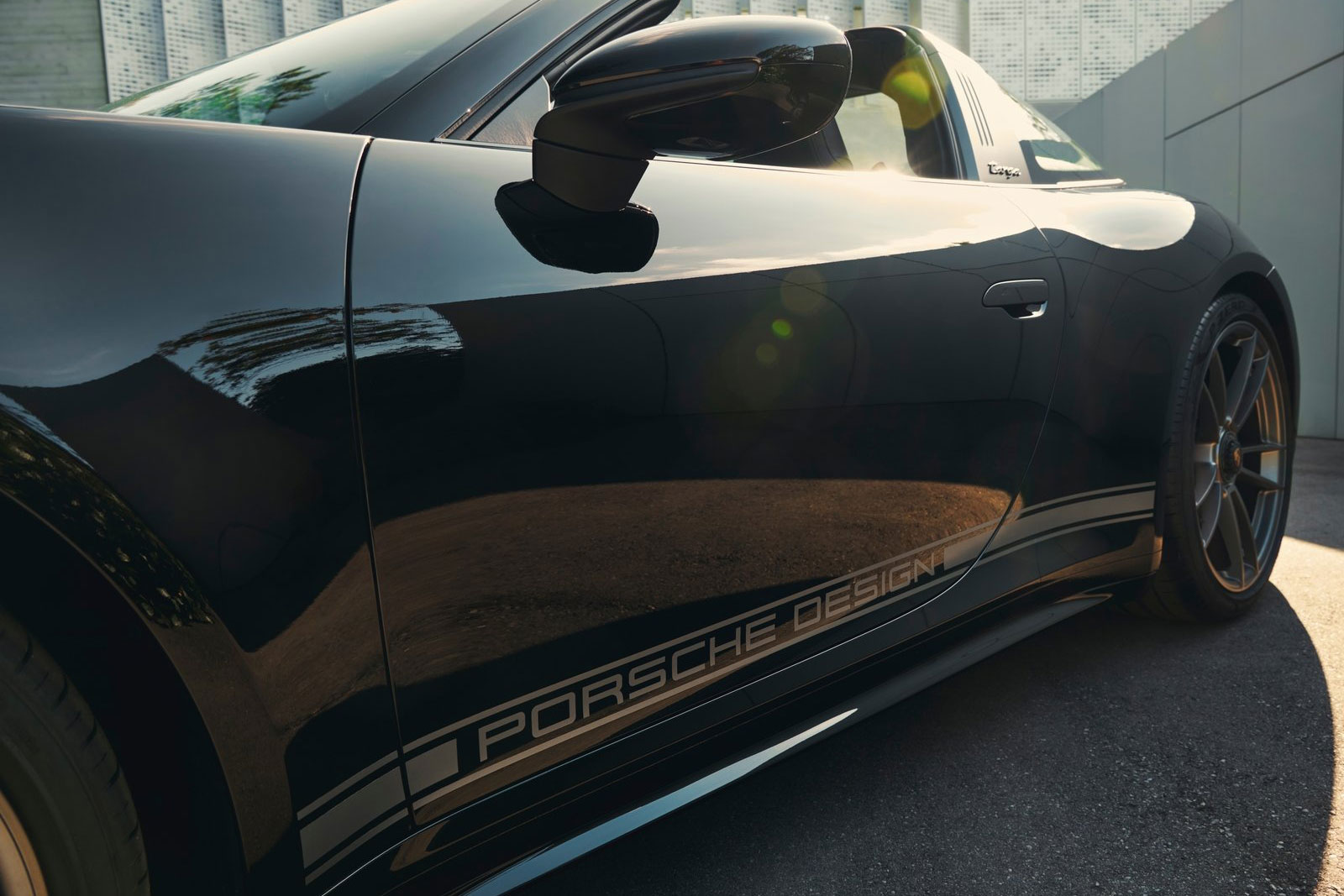 Als Hommage an Ferdinand Alexander Porsche greift das Unikat unter anderem die Farbgebung des von ihm entworfenen, legendären „Chronograph I“ von 1972 auf: In Exterieur wie Interieur dominiert die Farbe Schwarz. Klassische Seitenstreifen in Platinum seidenglanz und mit integriertem Porsche Design Schriftzug zieren die Flanken. Als besonderes Highlight wurde der Targa-Bügel gleichfalls in Platinum seidenglanz lasiert – eine Neu-Interpretation des gebürsteten Edelstahls des alten Modells. Der Targa-Schriftzug ist in Schwarz matt ausgeführt. Auf dem Gitter der Motorabdeckung am Heck sitzt analog zum Sondermodell eine „50 Jahre Porsche Design“-Plakette mit Faksimile-Unterschrift von Prof. Ferdinand Alexander Porsche.