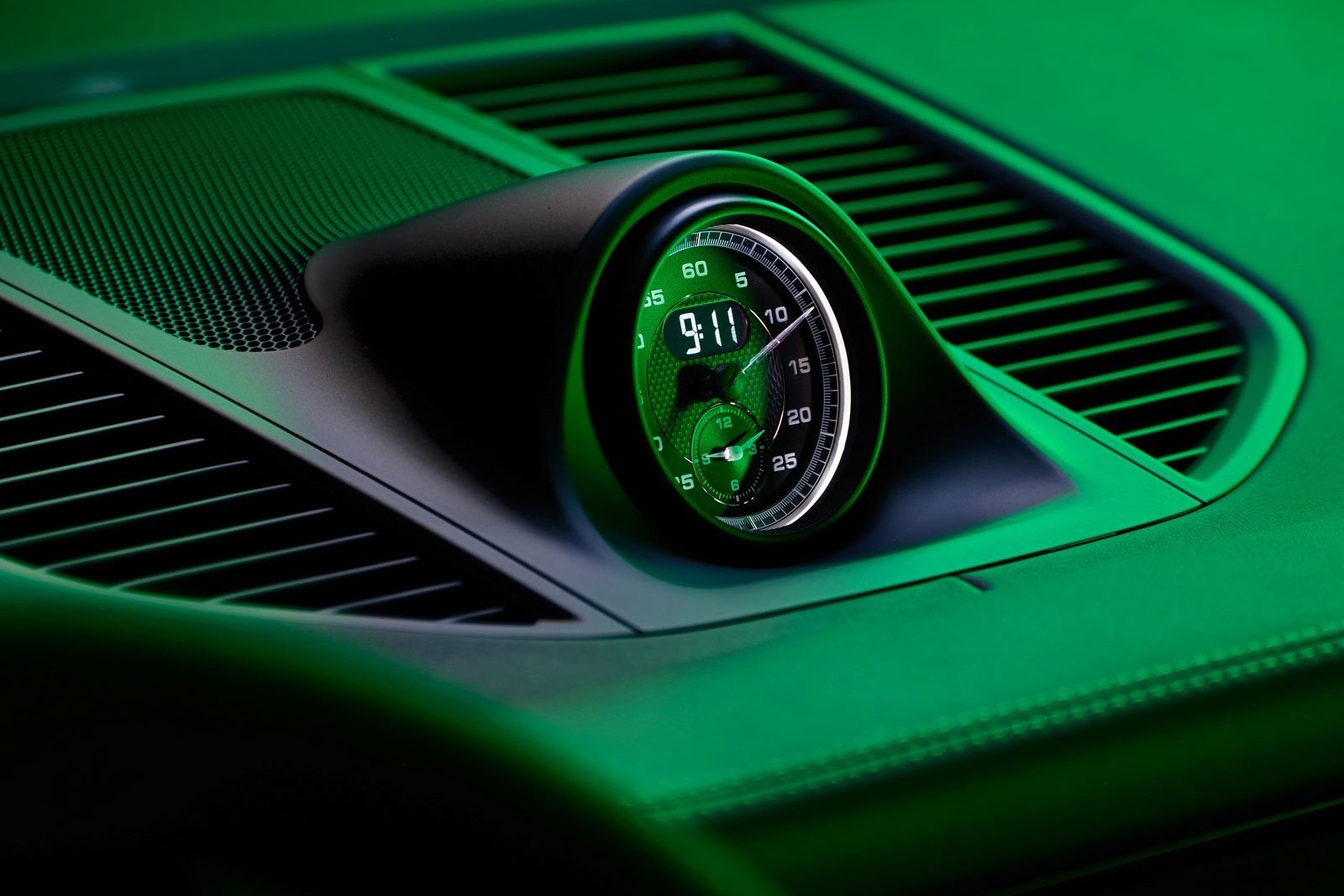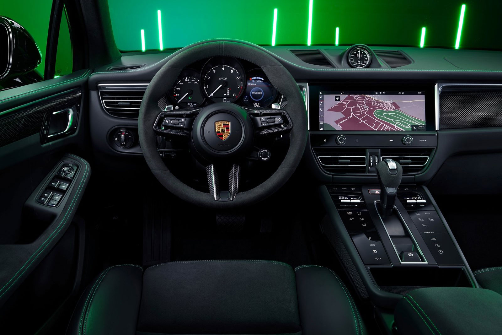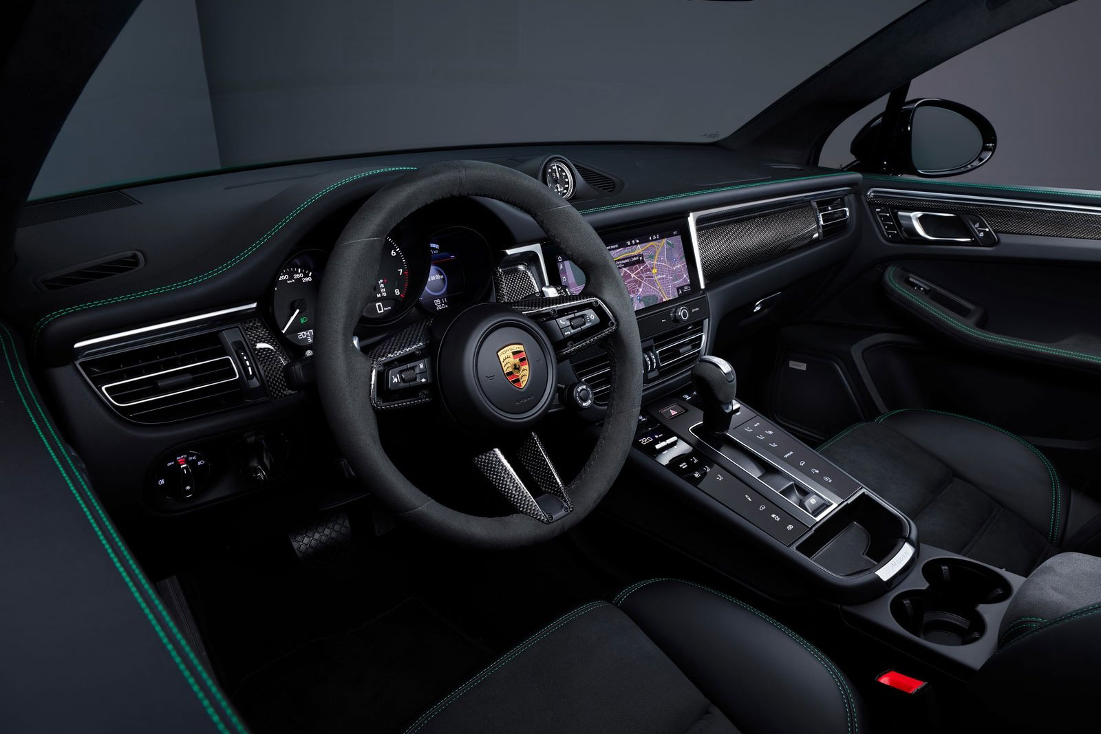 Der neue Porsche Macan bietet einen deutlich aufgewerteten Innenraum mit einer modern und elegant gestalteten Mittelkonsole. Ihr Bedienkonzept mit Touch-Flächen anstelle von haptischen Tasten bringt eine klare Struktur ins Cockpit. Im Zentrum des aufgeräumten Bedienmoduls sitzt ein neuer verkürzter Wählhebel. Die Analog-Uhr auf der Oberseite der Schalttafel gehört nun zum Serienumfang. Verschiedene Leder-Optionen sowie Kontrastnaht-Pakete in Enzianblau, Papaya oder Kreide setzen auf Wunsch neue farbliche Akzente im Interieur. Der Macan bietet darüber hinaus serienmäßig viele Online-Funktionen und -Dienste, die über das 10,9 Zoll große Full-HD-Touchdisplay des Porsche Communication Management oder per Sprachbefehl gesteuert werden. Die neuen Multifunktions- und GT-Sportlenkräder übernimmt der Macan vom 911.