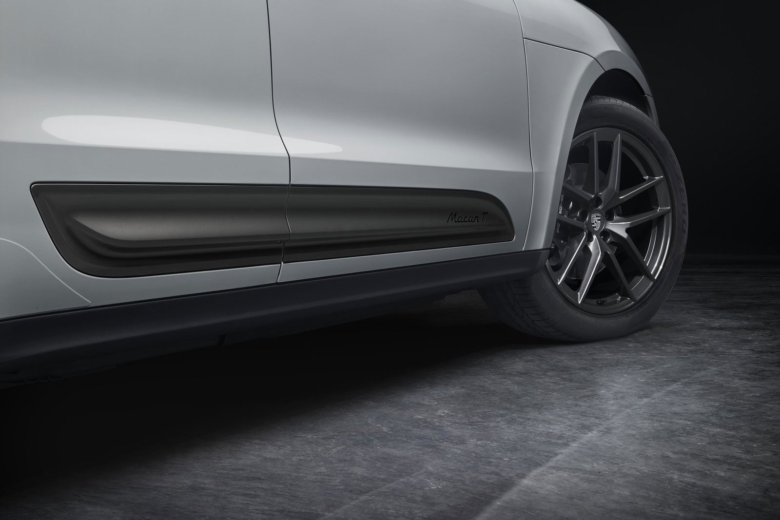 Optisch setzt sich der Macan T durch in Achatgraumetallic lackierte Elemente an Front, Flanke und Fahrzeugheck von anderen Macan Modellen ab. Die exklusive Kontrastfarbe findet sich an der lackierten Bugblende, Außenspiegeln, Sideblades, Dachspoiler und den Schriftzügen am Heck. Jeweils in glänzendem Schwarz lackierte Sportendrohre und Seitenscheibenleisten sind ebenfalls Serie. Auf den Sideblades ist der Schriftzug „Macan T“ in Schwarz zu lesen. Ab Werk steht der Macan T auf 20 Zoll großen Macan S-Rädern – exklusiv in dunklem Titan ausgeführt. Für die Außenlackierung kann aus 13 Uni-, Metallic- und Sonderfarben gewählt werden.