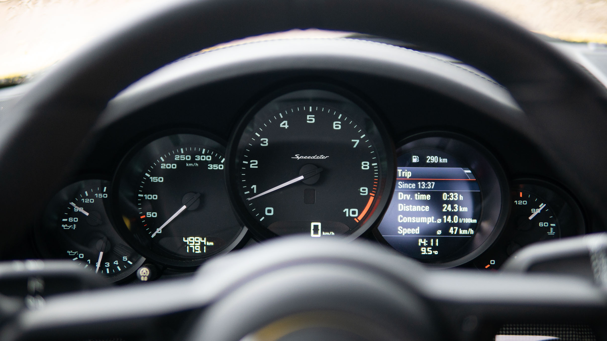 So nimmt der Porsche 911 Speedster dem Wetter dann schnell den Schrecken. Er überfordert Dich nicht, weil er wunderbar linear zu bedienen ist. Kein Drehmomentwucher überrascht am Kurvenausgang, kein Turbohammer rasiert den Grip der Cupreifen weg, nichts. Stattdessen: die wahre Freude.