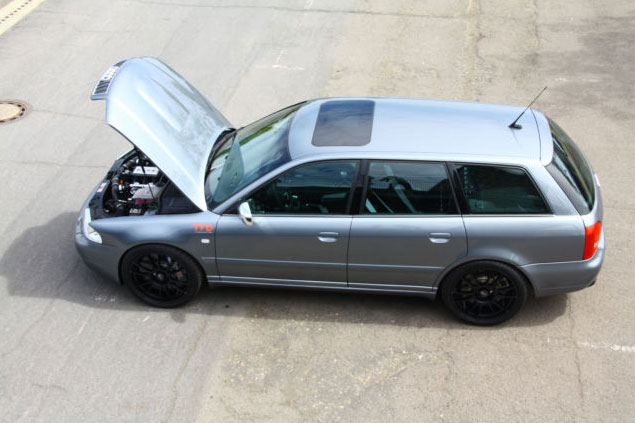 Denn unter der Haube des Kombi wurde so ziemlich alles umgebaut und auf Volle Power ausgelegt. Hier arbeitet ein auf drei Liter vergrößerter Biturbo-Sechszylinder aus dem Audi RS4. Der neue Motor ist gerade einmal 4.000 Kilometer gelaufen und lässt sich mit Superplus sowie Ethanol E85 betanken. Je nach Betankung und individueller Wahl des Piloten bringt es der Motor in fünf Stufen von 420 bis auf 1.200 PS. Zu welchen Fahrleistungen diese Power den nach außen sehr unscheinbar auftretenden Kombi befähig, verrät die Anzeige leider nicht.