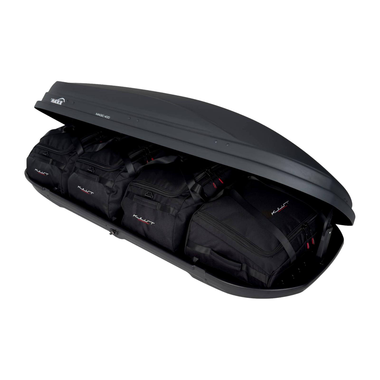 Dachboxtaschen-Sets Speziell zusammengestellte Sets für maximale Platznutzung Nutzen Sie den Platz Ihrer Dachbox maximal aus – mit dem Dachboxtaschen-Set für Ihre Dachbox. Wir haben aus 2 unterschiedlichen Taschenvarianten und verschiedenen Größen spezielle Dachboxtaschen-Sets passend für unterschiedliche Dachboxen zusammengestellt – für optimale Platznutzung und sichere Fahrt. Maximale Ordnung Dank der durchdachten Zusammenstellung der maßgeschneiderten Dachboxtaschen können Sie Ihre Dachbox einfach be- und entpacken und schaffen perfekte Ordnung. Die Taschen sind so gestaltet, dass Sie sie auch in der Dachbox einfach per Zipper öffnen können. Durchdachte Material- und Detailgestaltung Die strapazierfähigen KJUST Dachboxtaschen sind aus abriebfestem Polyamid mit spezieller Polyurethan-Beschichtung gestaltet. Sie sind feuchtigkeitsabweisend, hitze- und kältebeständig und leicht zu reinigen. Antirutsch-Elemente verhindern ein Hin- und Herrutschen beim Transport in der Dachbox. Die KJUST Dachboxtaschen überzeugen mit ihrem geringen Eigengewicht. Sie sind extrem leicht und lassen sich gut tragen. Die Reißverschlussgestaltung ermöglicht ein einfaches Be- und Entpacken der Taschen. Stabilität während der Fahrt Dank der Passgenauigkeit der Taschensets wird der Innenraum der Dachbox maximal ausgefüllt und unschönes Hin- und Herrutschen der Dachboxtaschen vermieden. Das Gepäck bleibt auch bei plötzlichen Lenkbewegungen zuverlässig an seinem Ort. Auch individuell zusammenstellbar Die Taschensets passen nicht zu Ihrer Dachbox? Stellen Sie sich einfach Ihr individuelles Set aus Basistaschen und der passenden Fronttasche zusammen.