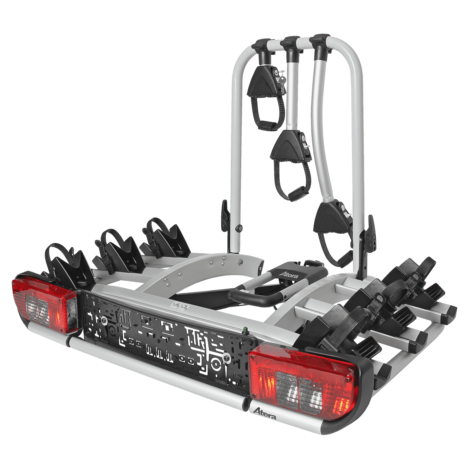 Der Fahrradträger Strada DL 3 von Atera ist ein sicherer, stabiler und qualitativ hochwertiger Fahrradträger. Dieser dient zum Transport von drei Fahrrädern. Ein viertes Fahrrad kann mit einer zusätzlichen Erweiterung transportiert werden. Die Stützlast der Anhängerkupplung muss mindestens 50 kg betragen. Die Montage erfolgt über einen Spannhebel. Nach anziehen des Spannhebels ist der Träger fest am Fahrzeug fixiert. Der Strada DL 3 hat zudem einen leichtgängigen Rollenauszug, der sogar bei montierten Fahrrädern den Zugang zum Kofferraum ermöglicht. Selbst bei großen Vans kann nun die weit ausladende Heckklappe geöffnet werden. Ist das Reiseziel erreicht zeigt der Strada eine weitere Art von Mobilität: Ruckzuck ist der Anhängerkupplungsträger mit den kompakten Maßen von einem Meter auf einen halben Meter im Kofferraum oder zum Überwintern bestens verstaut. Auch für den Transport von großen Rahmendurchmessern, bis 80 mm, bestens geeignet. Die Fahrräder und der Fahrradträger sind abschließbar. Dieser Fahrradträger ist mit einem 13-poligen Stecker ausgestattet. Der Kennzeichenhalter entspricht der Europäischen Norm (520 mm x 110 mm).