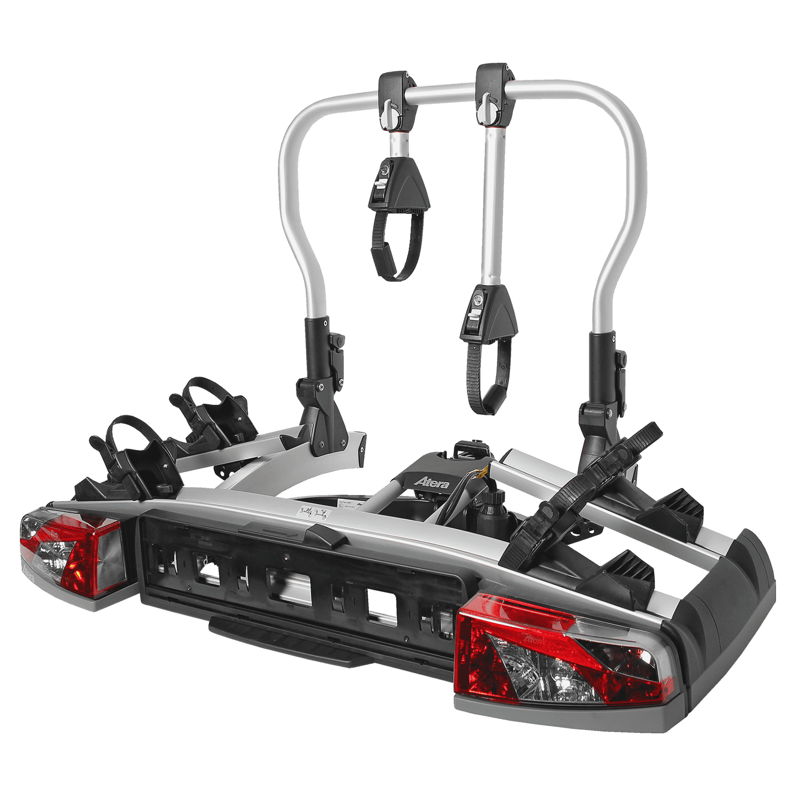 Kompakter Fahrradträger mit höchstem Komfort Der Atera Strada EVO 2 ist ein kompakter, stabiler und äußerst sicherer Fahrradträger mit höchstem Komfort. Der Träger ist schnell auf nahezu allen Anhängerkupplungen montiert. Mit diesem Fahrradträger können Sie problemlos 2 Fahrräder sicher transportieren. Für einen optimalen Halt des Fahrrades, sowie zum Schutz des Fahrradrahmens, wurde die Fahrradhalterung mit Gummieinlagen versehen. Die Halterungen sind auch für große Rahmendurchmesser, bis 80 mm, bestens geeignet. Die Reifenhalterung lässt sich optimal auf Ihren Fahrradreifen einstellen. Bei datenbusgesteuerten Fahrzeugen ist die Beleuchtungsanlage nach Anbringung des Trägers auf korrekte Funktion zu prüfen. Der Atera Strada EVO 2 lässt sich mit dem leichtgängigen Rollauszug auch im beladenen Zustand abklappen. Zusätzlich hat der Fahrradträger auch einen seitlichen Unterfahrschutz sowie abnehmbare Abstandshalter. Dieser Fahrradträger ist mit einem 13-poligen Stecker ausgestattet. Bitte beachten Sie, dass in einigen Ländern der EU für die Verwendung eines Fahrradträgers auch ein 13-poliger Elektrosatz vorgeschrieben ist (zum Beispiel Deutschland & Österreich). Der Kennzeichenhalter entspricht der Europäischen Norm (520 mm x 110 mm).