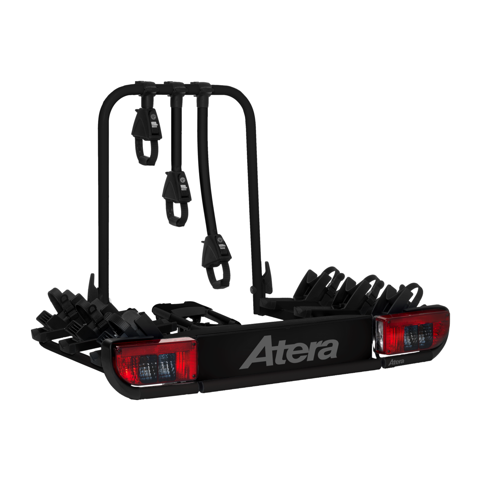 Atera Strada Sport 3 black edition – komplett vormontiert – auspacken und los geht’s Die Montage erfolgt über einen Spannhebel. Nach Anziehen des Spannhebels ist der Träger fest auf der Anhängerkupplung fixiert. Die Fahrräder und der Fahrradträger sind abschließbar. Schlösser und Schlüssel sind im Lieferumfang dabei. Der Strada Sport 3 black edition ist für den Transport von 3 Fahrrädern oder E-Bikes geeignet. Ein viertes Fahrrad kann mit einer zusätzlichen Erweiterung transportiert werden. Die Stützlast der Anhängerkupplung muss mindestens 60 kg betragen. Des weiteren verfügt der Träger über einen Abklappmechanismus, der auch bei montierten Fahrrädern den Zugang zum Kofferraum ermöglicht. Ist das Reiseziel erreicht, zeigt der Strada einen weiteren Vorteil: Klappen Sie den Haltebügel nach unten und der Fahrradträger kann im Kofferraum verstaut werden. Auch für den Transport von Fahrrädern mit bis zu bis 80 mm großen Rahmendurchmessern bestens geeignet. Durch die Atera „Frame Protection“ an der Rahmenhalterung wird der Fahrradrahmen bestens geschützt und sicher fixiert. Für Fahrräder mit breiten Reifen (ab 2,4 Zoll) gibt es optional austauschbare Rastbänder, diese finden Sie unter „passendes Zubehör“. Dieser Fahrradträger ist mit einem 13-poligen Stecker ausgestattet. Bitte beachten Sie, dass in einigen Ländern der EU für die Verwendung eines Fahrradträgers auch ein 13-poliger Elektrosatz vorgeschrieben ist (zum Beispiel Deutschland & Österreich). Der Kennzeichenhalter entspricht der Europäischen Norm (520 mm x 110 mm).