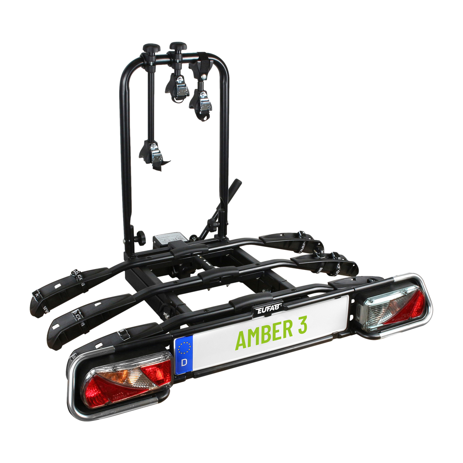 Der Eufab Amber Fahrradträger ist bestens für den Transport Ihrer Fahrräder, oder E-Bikes geeignet. Mit seinem abschließbaren Schnellverschluss ist die Montage des Trägers auf der Anhängerkupplung ein Kinderspiel und sorgt für eine sichere Befestigung während der Fahrt. Die Fahrräder werden durch stabile Rahmen- und Reifenhalter mit Textilspanngurten sicher fixiert, die Stahlschienen mit Kunststoffradhalterung sorgen für eine zuverlässige Unterstützung. Der Amber Fahrradträger ist sogar für Fahrräder mit Oversize- und Y-Rahmen bis zu einem Durchmesser von 8,50 cm geeignet, was seine Vielseitigkeit unterstreicht. Ein weiteres Merkmal des Amber Fahrradträgers ist sein Abklappmechanismus mit Zusatzsicherung, der es ermöglicht, den Kofferraum bei Kombis uns PKWs zu öffnen, selbst wenn die Fahrräder montiert sind. Dies ist besonders praktisch in Situationen, in denen der Zugang zum Kofferraum erforderlich ist, während die Fahrräder bereits auf dem Träger sind. Der Eufab Amber Fahrradträger ist kompatibel mit nahezu allen Anhängerkupplungstypen und bietet eine maximale Flexibilität für verschiedene Fahrzeugmodelle. Zusätzliches Zubehör wie eine Auffahrschiene oder abschließbare Rahmenhalter mit Ratschenbefestigung sind ebenfalls erhältlich, um die Funktionalität des Trägers weiter zu verbessern. Diese und weitere Artikel finden Sie unter „passendes Zubehör“. Bereit für unbeschwerte Fahrradabenteuer? Vertrauen Sie auf den Eufab Amber Fahrradträger für Ihre nächste Reise. Dieser Fahrradträger ist mit einem 13-poligen Stecker ausgestattet. Bitte beachten Sie, dass in einigen Ländern der EU für die Verwendung eines Fahrradträgers auch ein 13-poliger Elektrosatz vorgeschrieben ist (zum Beispiel Deutschland & Österreich). Der Kennzeichenhalter entspricht der Europäischen Norm (520 mm x 110 mm). Abmessungen (BxHxT): ca. 102 x 74 x 72 cm