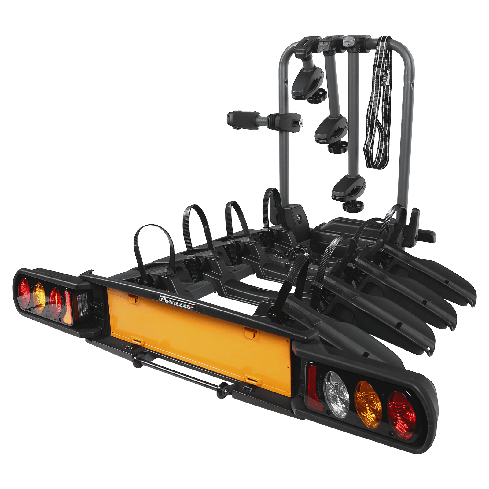 Die robuste Konstruktion des PERUZZO Pure Instinct ermöglicht einen sicheren und unkomplizierten Transport Ihrer Fahrräder. Jedes Fahrrad steht sicher und fest auf einer extrabreiten Halteschiene (für Reifenbreite bis max. 10 cm) und wird zusätzlich durch einen Haltearm am Rahmen (max. Rahmendurchmesser: 5 cm) fixiert. Der Pure Instinct kann über ein Fußpedal-Mechanismus abgeklappt werden – damit Sie auch bei montierten Fahrrädern an den Kofferraum gelangen. Der Fahrradträger ist durch ein Schloss diebstahlgeschützt. Unter „passendes Zubehör“ finden Sie eine zusätzliche Abschließfunktion für die Haltearme. Durch seinen Faltmechanismus ist der Träger einfach zusammengeklappt und kann platzsparend gelagert werden. Dieser Fahrradträger ist mit einem 13-poligen Stecker ausgestattet. Bitte beachten Sie, dass in einigen Ländern der EU für die Verwendung eines Fahrradträgers auch ein 13-poliger Elektrosatz vorgeschrieben ist (zum Beispiel Deutschland & Österreich). Der Kennzeichenhalter entspricht der Europäischen Norm (520 mm x 110 mm).