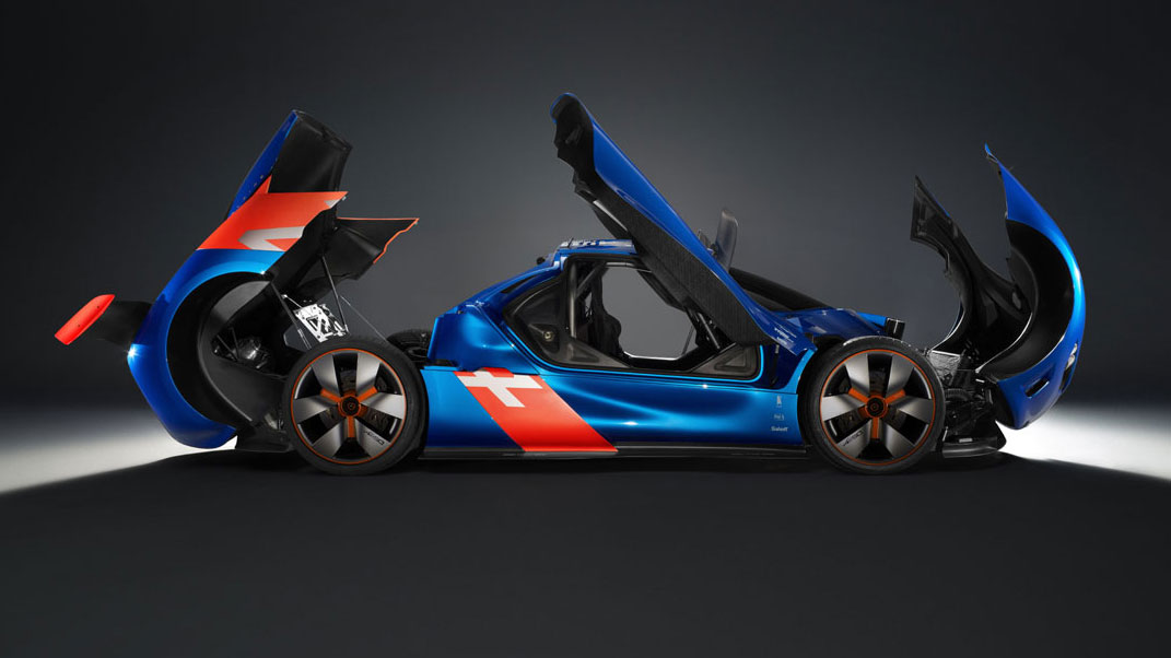 Eine Verbeugung vor der flachen „Flunder“ aus der Sportwagenschmiede von Jean Rédélé (1922-2007) stellt schließlich auch das Blau der Karosserielackierung dar. Der Farbton wurde eigens für die Renault Studie angemischt und ähnelt dem klassischen Alpine Blau der A 110. Die Karosserie ist komplett aus Kohlefaser gefertigt. Wie es sich für Sportwagen gehört, ist die Fronthaube vorne angeschlagen, während die Motorhaube nach hinten öffnet.