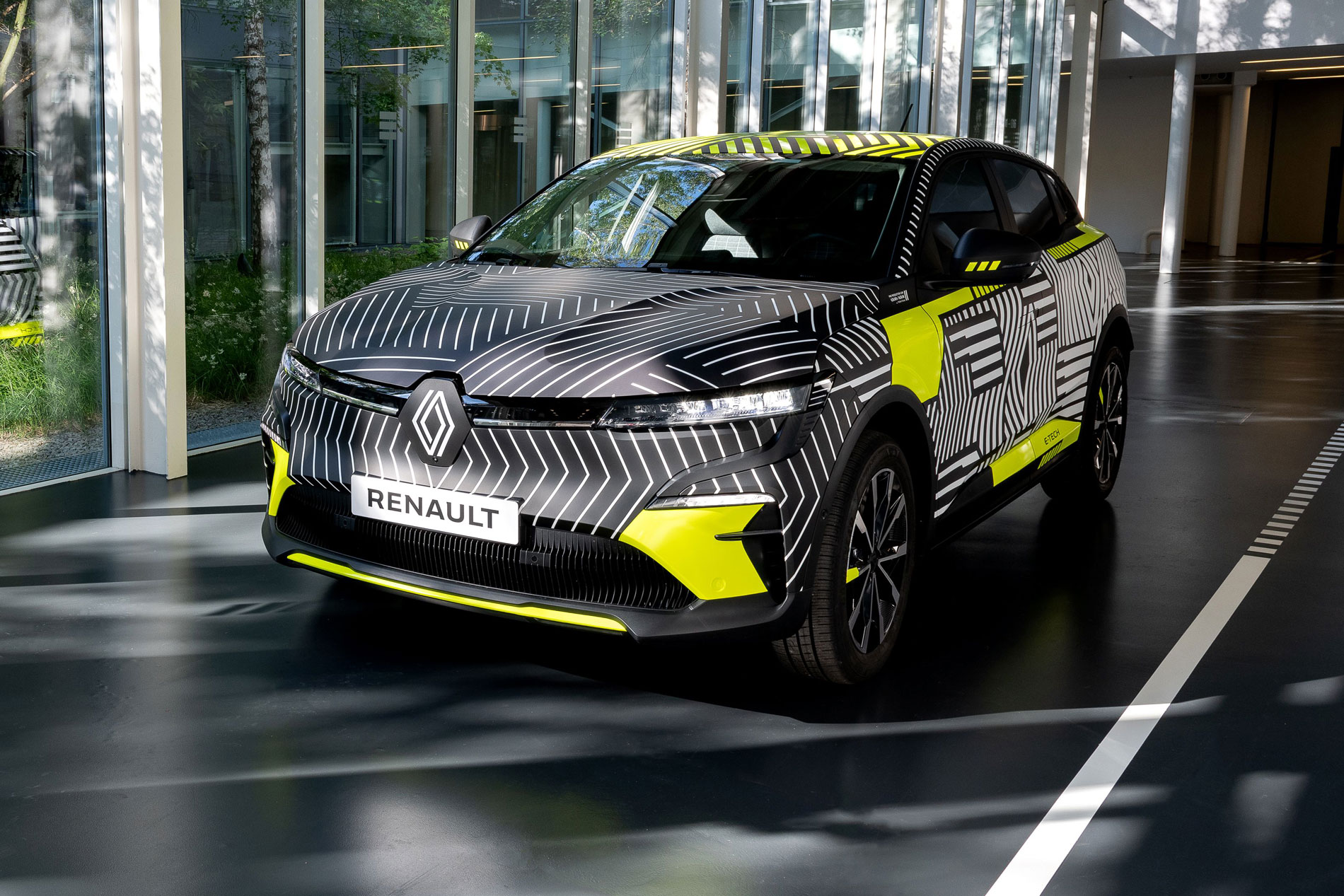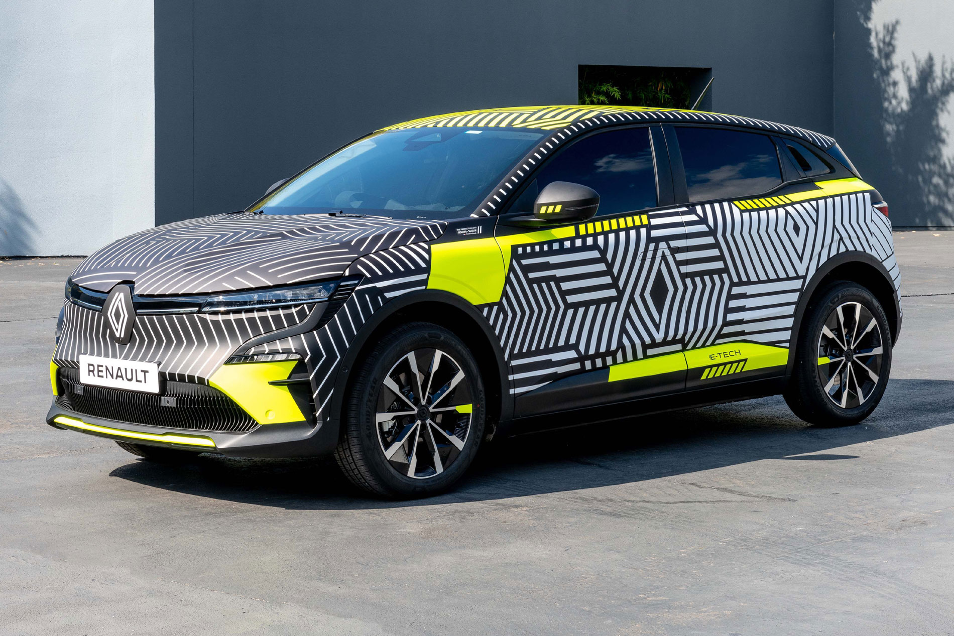[adrotate group=“1″]Der neue Mégane E-Tech Electric – auch MéganE (sprich: Mégane e“) genannt – basiert auf der CMF-EV-Plattform der Allianz Renault-Nissan-Mitsubishi und wird über einen 160 kW (217 PS) starken E-Motor und ein 60 kWh-Batteriepaket verfügen. Die WLTP-Reichweite liegt bei bis zu 450 km. 30 Vorserienfahrzeuge sind in diesem Sommer zu Erprobungsfahrten mit Renault Ingenieuren auf öffentlichen Straßen unterwegs. Die im französischen Renault Werk Douai gefertigten Vorserienfahrzeuge sind mit einem von Renault Design entworfenen Muster getarnt. Dieses Muster besteht aus einem Spiel von Linien und Mustern in Anlehnung an das neue Renault Logo.