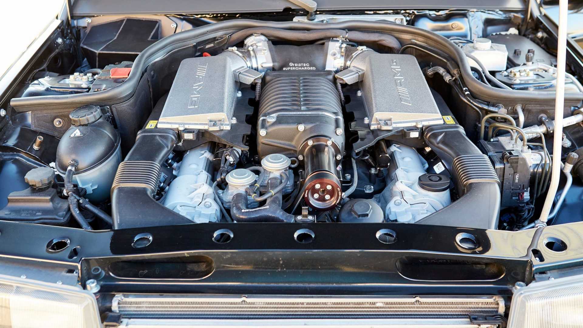 Unter der Haube des Franken-Benz arbeitet der 6,2-Liter-V8 aus dem 63er AMG. Allerdings bekam er vom Tuner noch einen Doppelschrauben-Kompressor verpasst. Und laut eigenen Angaben geht das Ding wie die Hölle und die Geräuschkulisse des Kompressors ist beängstigend.