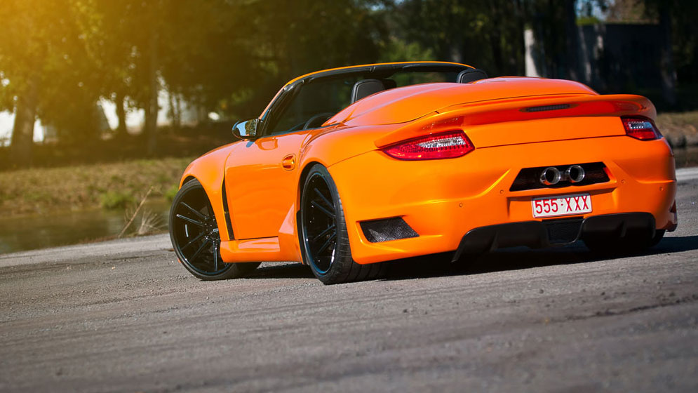 Eine solche Ausnahme ist dieses 911 Cabrio vom Typ 997. Im Heck schlummert zwar ein von Ruf getunter Sechszylinder-Boxermotor mit 620 PS, doch dem Eigentümer war das Wissen um diese Leistung noch nicht genug. Er wollte sie auch auf den ersten Blick zu erkennen geben. Darum brachte er sein Auto zum belgischen Tuner RSQuattro. Das Endprodukt hat mit unauffälliger Optik nichts mehr zu tun. Es beginnt bei der knalligen Lackierung in Metallic-Orange aus der Farbkarte von Lamborghini. Weiter geht es mit riesigen Lufteinlässen in der Frontschürze. Außerdem wurden die Kotflügel vorne und hinten extrem verbreitert. Am Heck erstreckt sich ein feststehender Heckbürzel über die gesamte Fahrzeugbreite und die armdicken Auspuffrohre dürfen die Abgase über dem Kennzeichen ins Freie leiten. Abgerundet wird das Ganze von einem Verdeckdeckel im Speedsterdesign und 20-Zoll großen und überbreiten Felgen von ADV.1-Wheels. Wir sind gespannt, ob wir das Gefährt einmal live auf der Straße sehen werden. Wiedererkennen werden wir es jedenfalls.