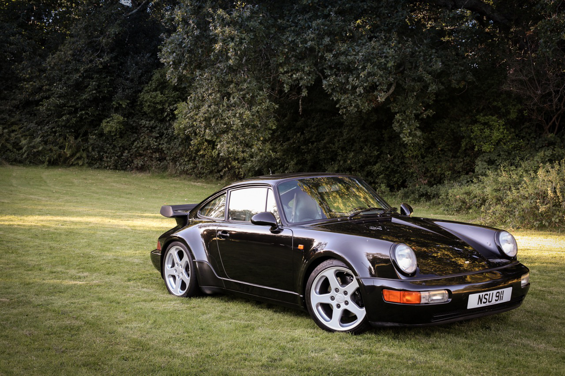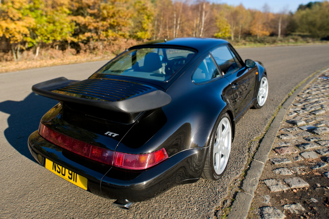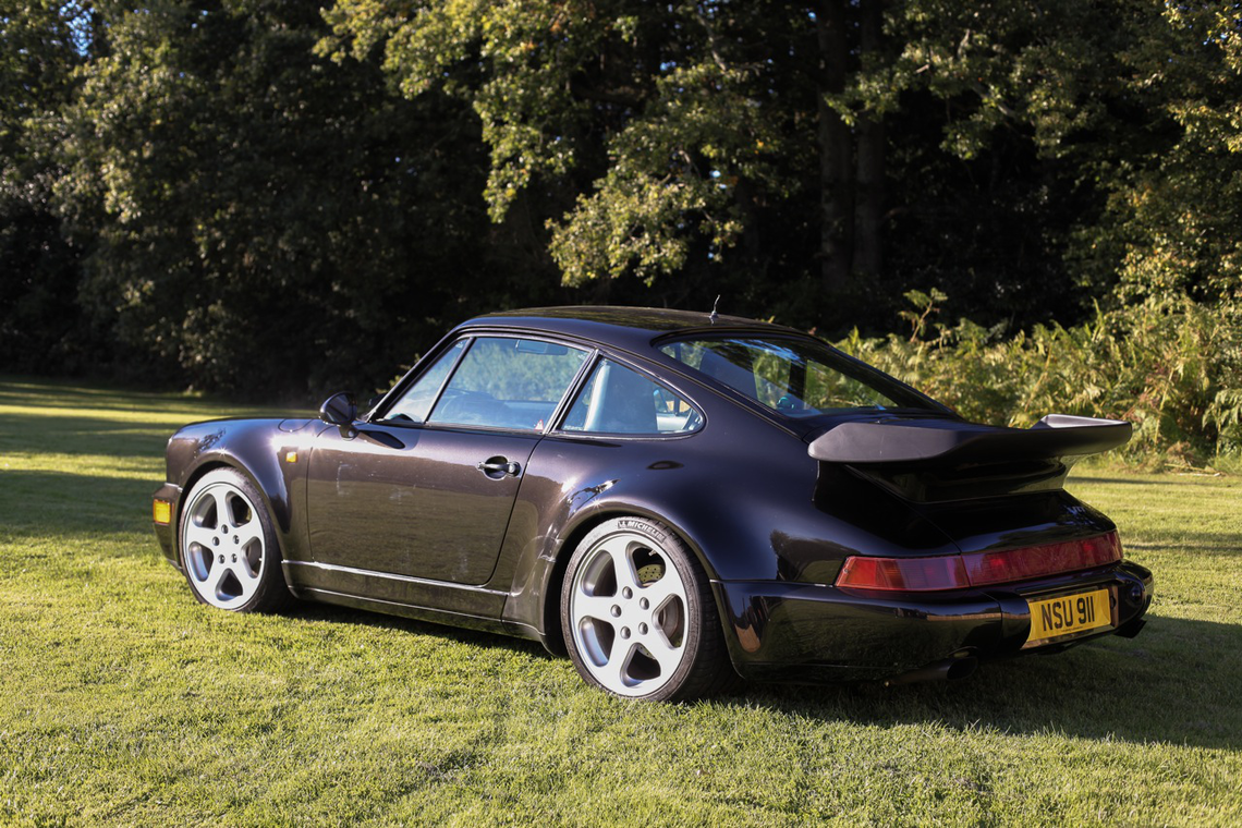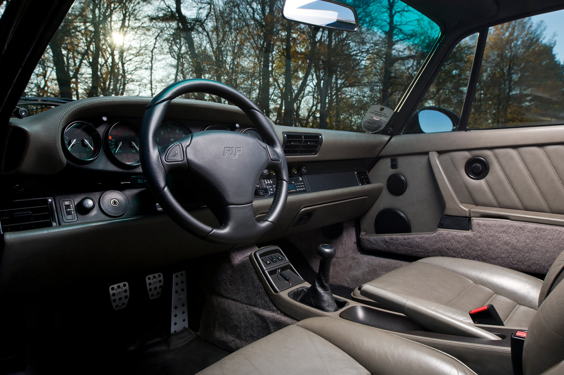 Deutlich wird dies auch bei diesem Exemplar: Ein 964 der 30-Jahre-Jubiläumsserie, also bereits serienmäßig im Werksturbolook mit breiten Backen, Allradantrieb und dem Fahrwerk vom damaligen turbo. Im Jahre 1997 kam er in den persönlichen Fuhrpark Alois Rufs und wurde dort zum RCT (Ruf Carrera Turbo). Die Idee war simpel: während das Nachfolgemodell des 964, der 993, bereits als turbo mit Allradantrieb gebaut wurde, gab es den 964 turbo ausschließlich mit Hinterradantrieb. Bei Ruf implantierte man einen 3,6-Liter turbo-Boxer in den Allrad-964, pumpte ihn mittels neuem Turbolader und überarbeiteter Motronic auf 385 PS und hatte schlussendlich einen Turbo-Elfer mit Allradantrieb im Kleid eines 964. Die dazugehörigen 18-Zoll-Felgen von Speedline stehen der Karosserie wie angegossen. Vom RCT wurden weniger als 100 Exemplare gebaut.