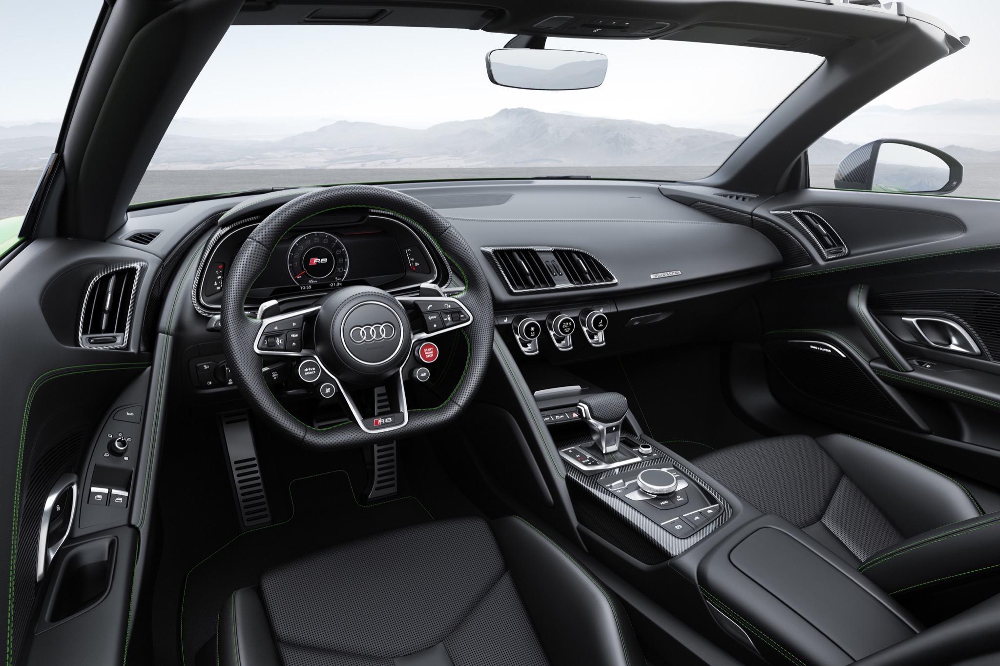 Zwei Premieren gibt es für Audi darüber hinaus zu feiern: der R8 Spyder V10 plus ist das stärkste offene Audi-Serienmodell, das je die Werkshallen verlassen hat. Und: mit seiner Einführung durchbricht Audi beim Grundpreis die 200.000 Euro-Schallmauer. Dieser beträgt in Deutschland 207.500 Euro und damit 17.500 Euro mehr als für das plus-Coupé. Darin noch nicht enthalten ist das optionale Designpaket micrommatagrün Audi exclusive (Fotofahrzeug) – für alle, die es noch etwas außergewöhnlicher mögen. Dann ist der offene V10 im extrovertierten Grün lackiert, Singleframe und Abgasanlage hingegen schwarz. Der Innenraum mit den serienmäßigen Schalensitzen wird dann ebenso mit schwarzem Leder und grünen Ziernähten ausgestattet.