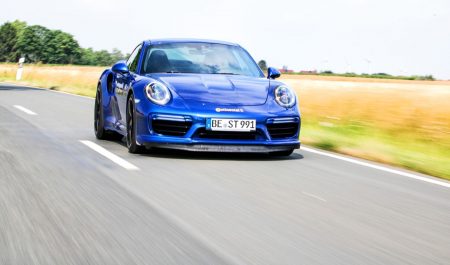 Es sind mal wieder die nackten Zahlen, die einfach beeindrucken. Und dabei ist es erst die Stufe Eins des Tuningprogramms, mit dem der 991 turbo S von edo competition bereits den Rekord für den derzeit schnellsten 991 turbo geknackt hat. 344,18 Km/h, von 0 auf 100 in 2,7 Sekunden, auf 200 geht’s in 8,6 Sekunden, auf 300 aus dem Stand in sagenhaften 23,4 Sekunden. Dabei nimmt der „Blue arrow“ genannte Elfer dem bisherigen Spitzenmodell der Turboreihe, dem turbo S Exclusive Series, pro Disziplin immer mehr Zeit ab.