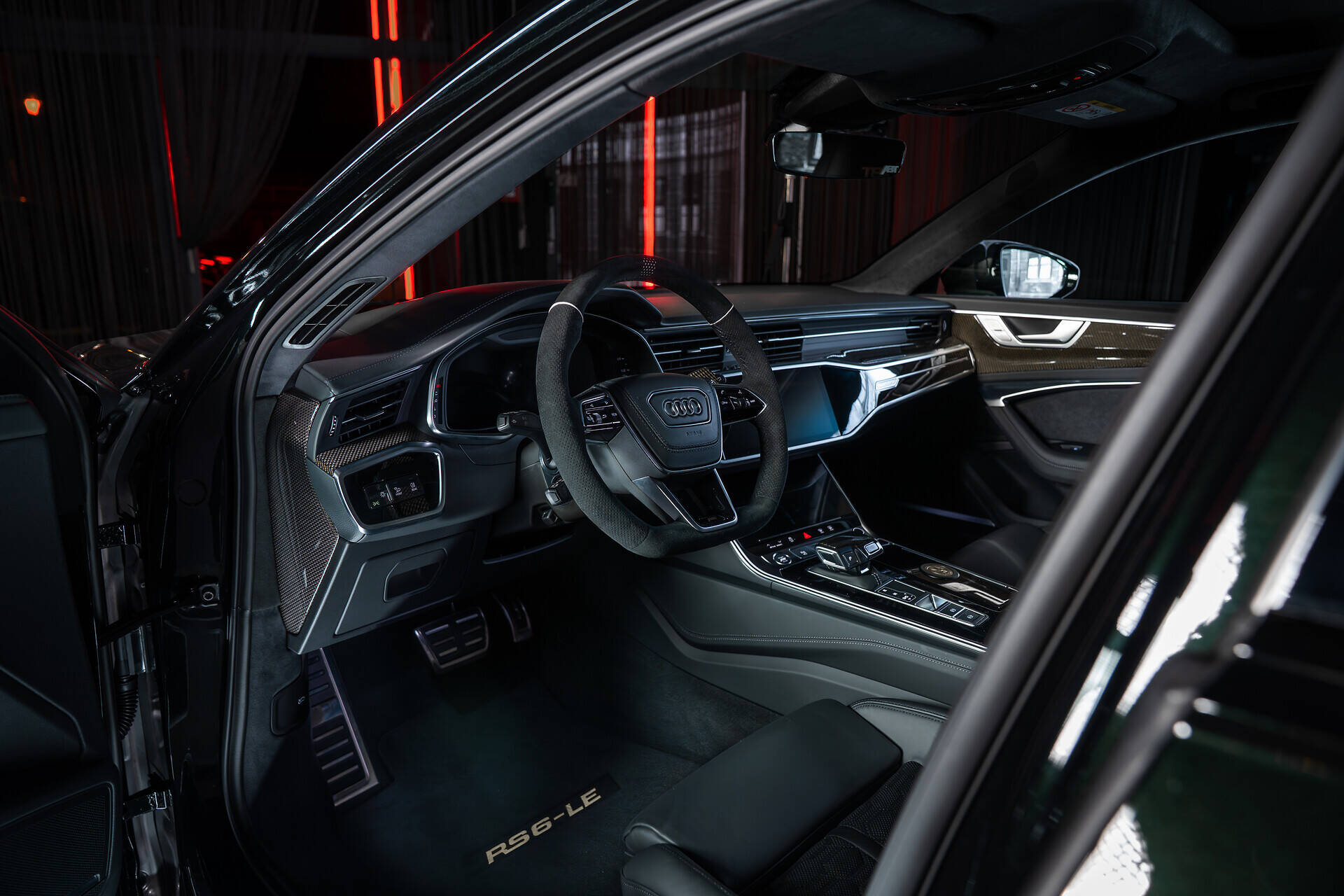Das Aerodynamikpaket präsentiert sich entsprechend kompromisslos. Zum Umfang gehören unter anderem ein Aufsatz für den Frontgrill sowie ein Einsatz für die Motorhaube aus glänzendem Sichtcarbon. Dazu kommen Radhausentlüftungen mit „RS6-LE 800“-Schriftzug, ein Heckflügel mit integrierten Aeroblades sowie Seitenschweller und Spiegelkappen aus Carbonfaser.