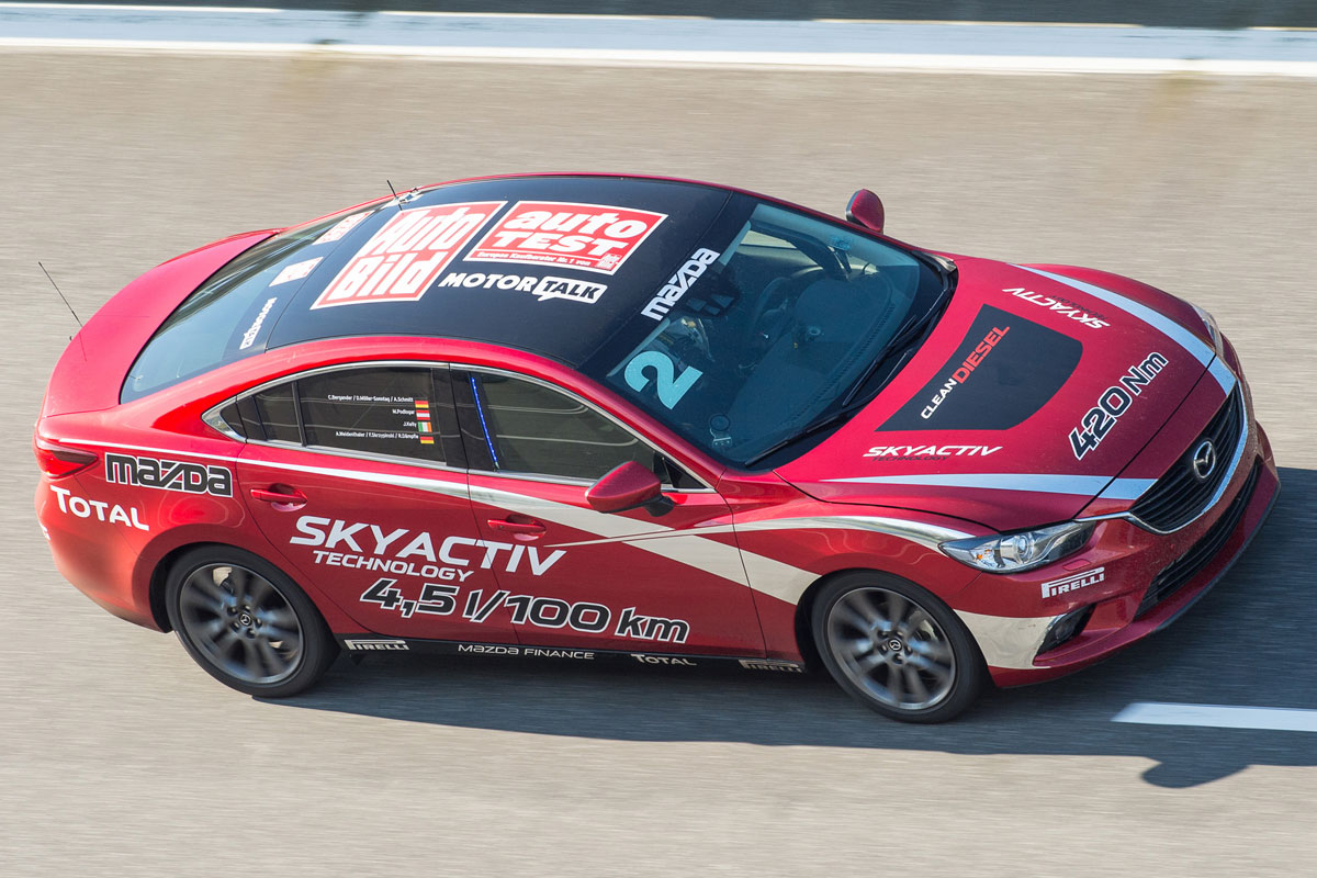 24 Stunden, 434 Runden und 5.340 Kilometer: Der Marathon auf dem Papenburger Hochgeschwindigkeitskurs hatte es in sich. Selbst ohne einen Lorbeerkranz hätten sich die Fahrer und die Beteiligten im Hintergrund einen Applaus verdient. Doch die Quintessenz des Events von Mazda ist fulminanter, als es viele Motorsportfans erwartet hätten: Die drei Mazda 6 SKYACTIV-D 175 stellten bei dem Rennen gleich 20 Weltrekorde auf. Da wird auch der Pragmatiker hellhörig. Schließlich handelt es sich nicht um ein rasantes Unikat. Der Rekordsegen geht auf das Konto eines Serienmodells.