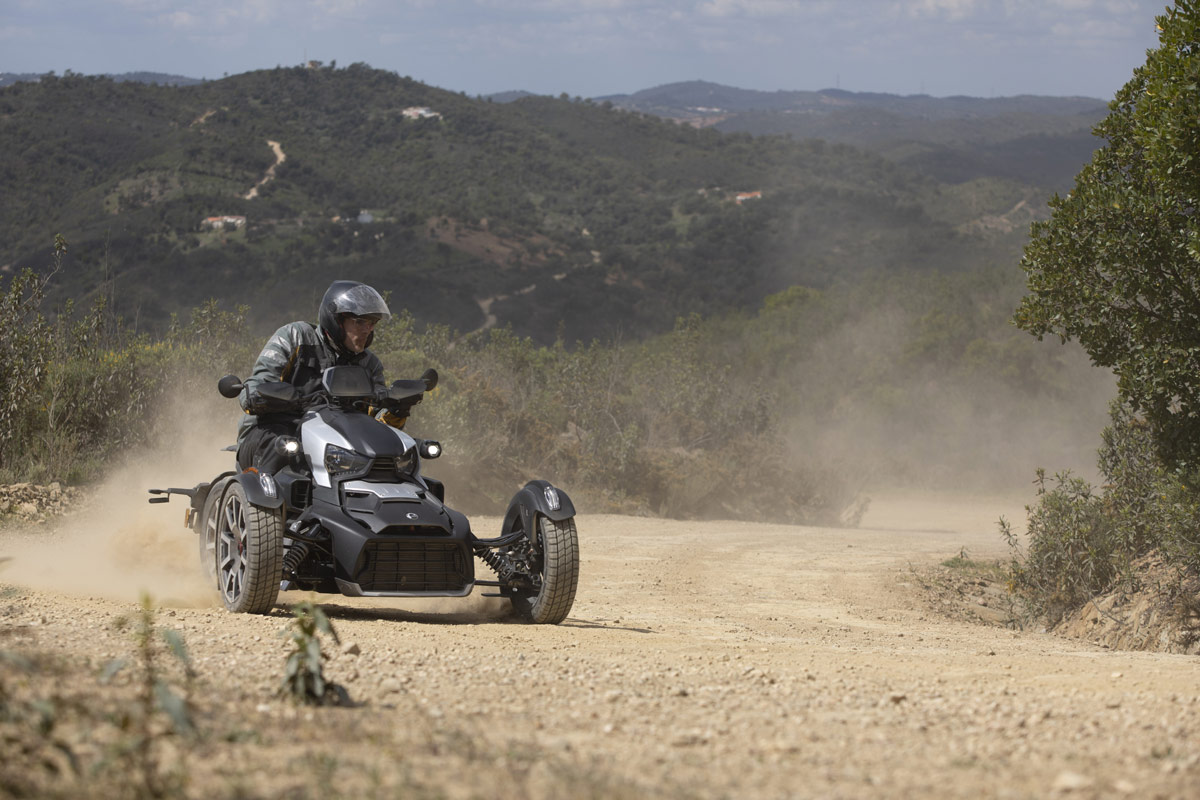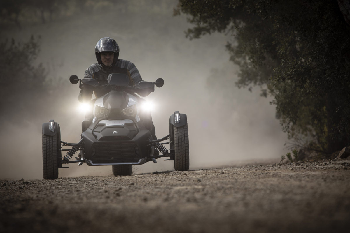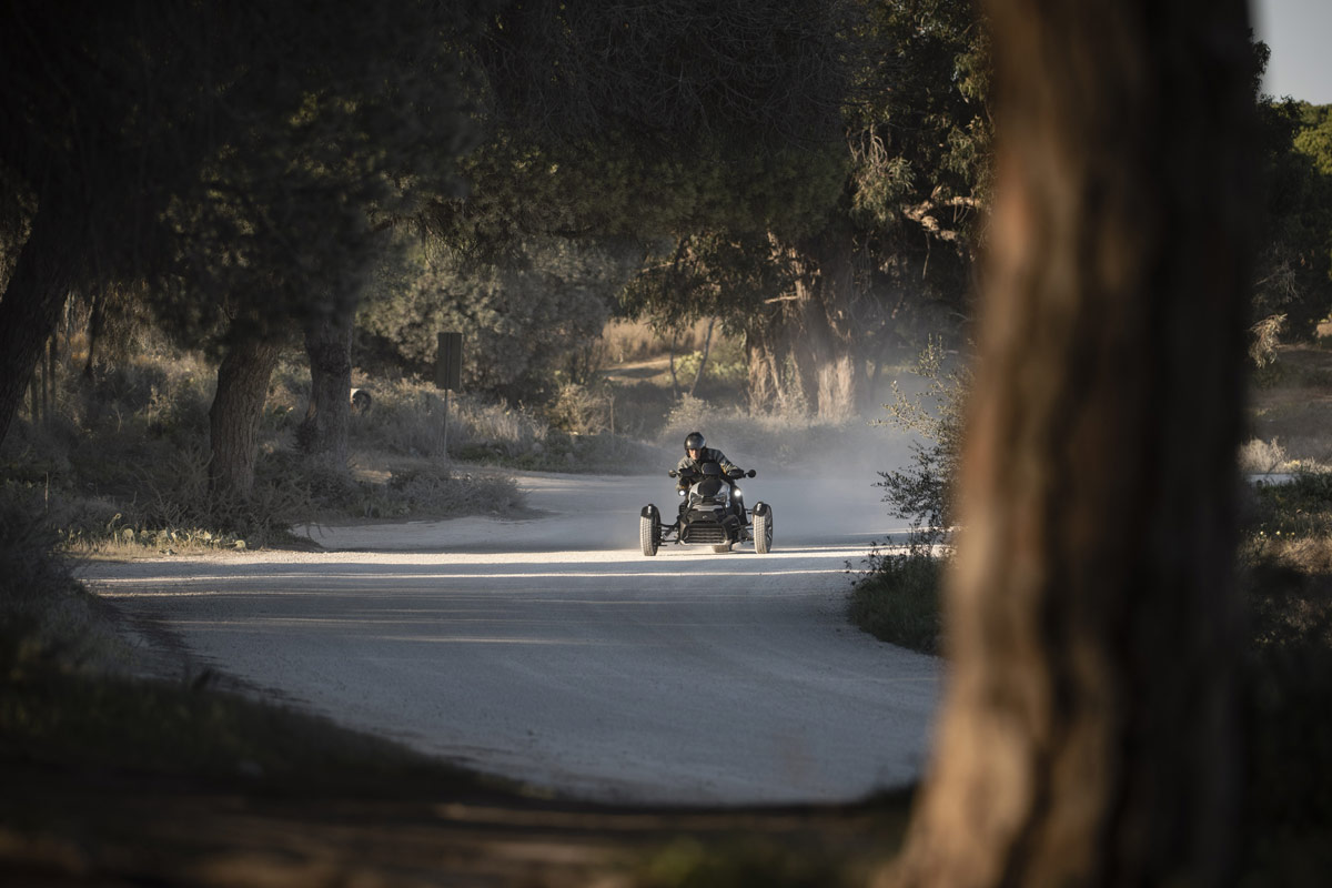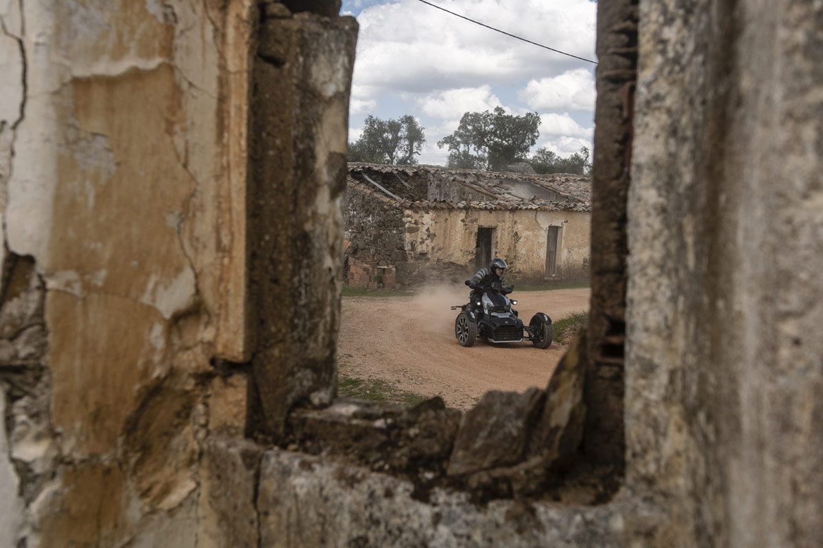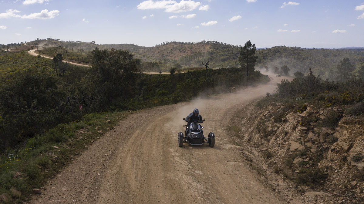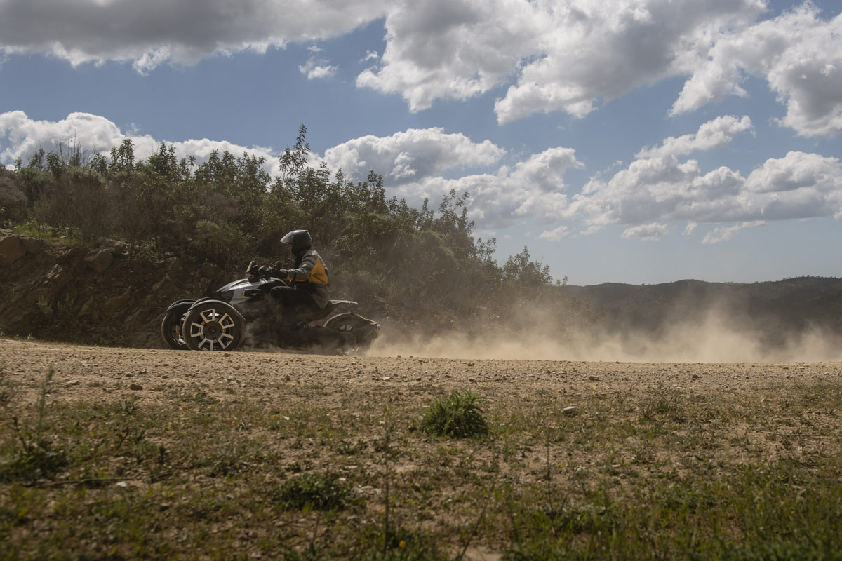 Und genau da beginnt der Spaß! Der Ryker liebt unbefestigte Straßen, wie sie es speziell in Südeuropa noch zu Hauf gibt, Bis 50 km/h lässt die Traktionskontrolle in Zusammenarbeit mit dem ESP dann nämlich phänomenale Driftwinkel zu, die ganz sanft bei Übermut wieder eingefangen werden. Das Fahrwerkssetup harmoniert wunderbar mit dem ABS. Etwa dann, wenn man über kurze Bodenwellen die nächste Kurve anbremsen will. Aber hier spielt der reine Speed sowieso kein Rolle, sondern der Staub auf Deinen Zähnen. Wie der da hinkommt? Vom Grinsen, wenn man leicht die Bremse drückt und Vollgas gibt, bis man mit viel Schlupf eine riesige Staubwolke um sich aufbaut und hinter sich herzieht. Eat my dust!