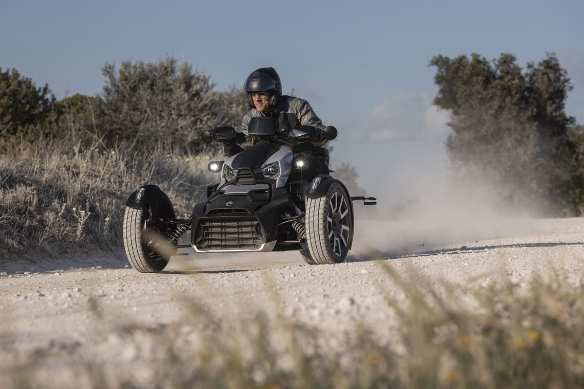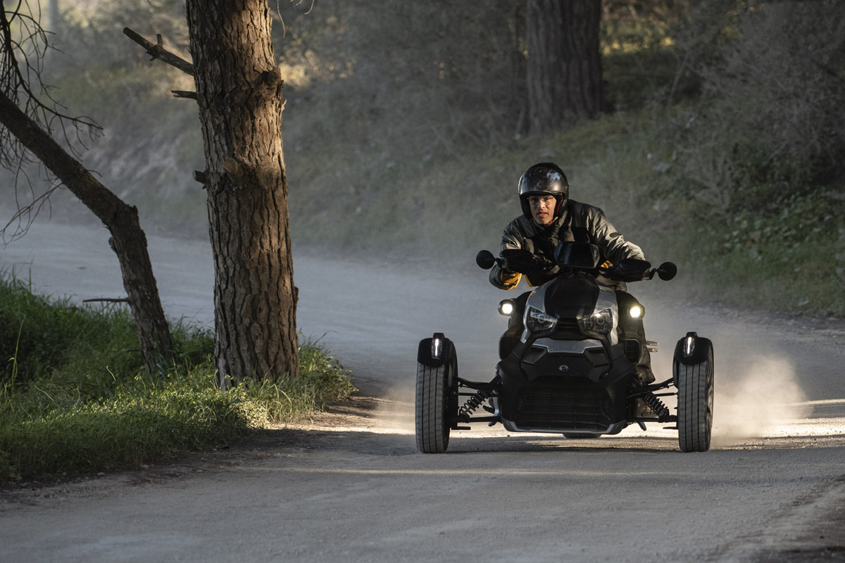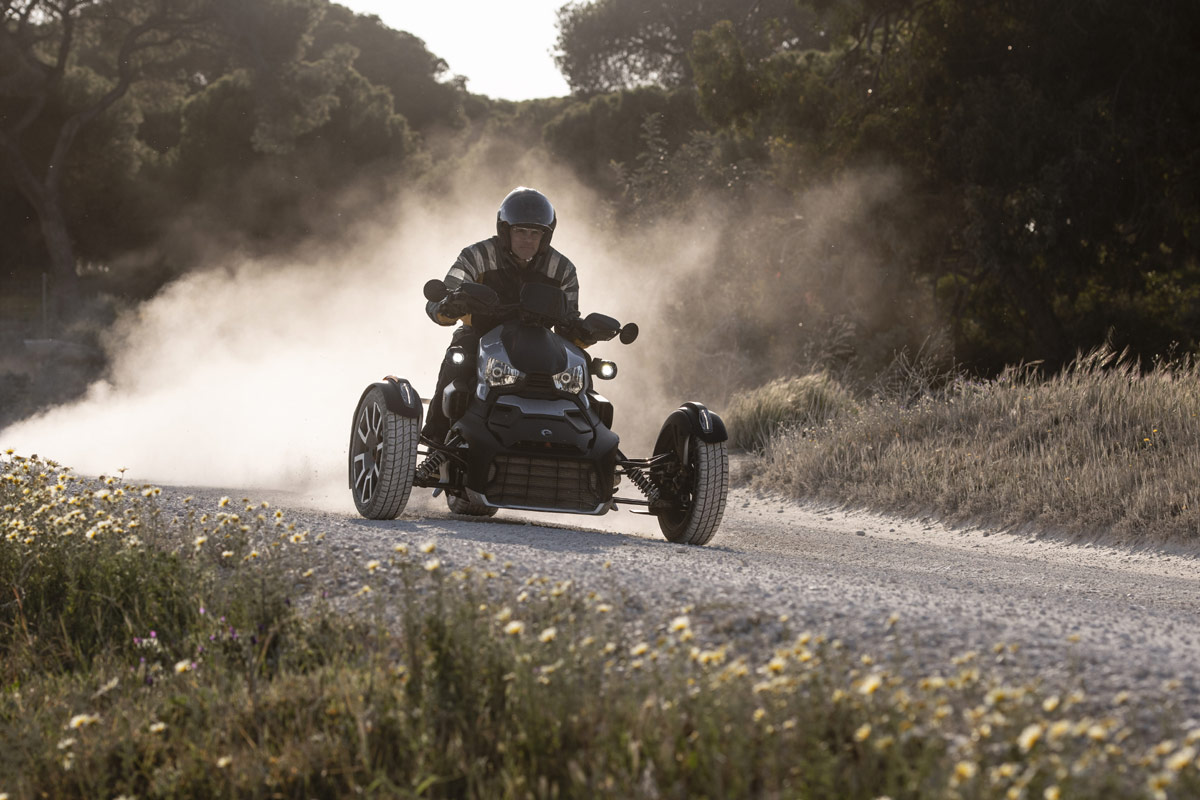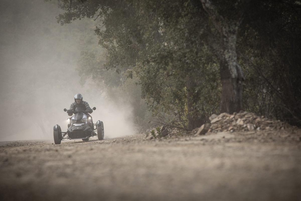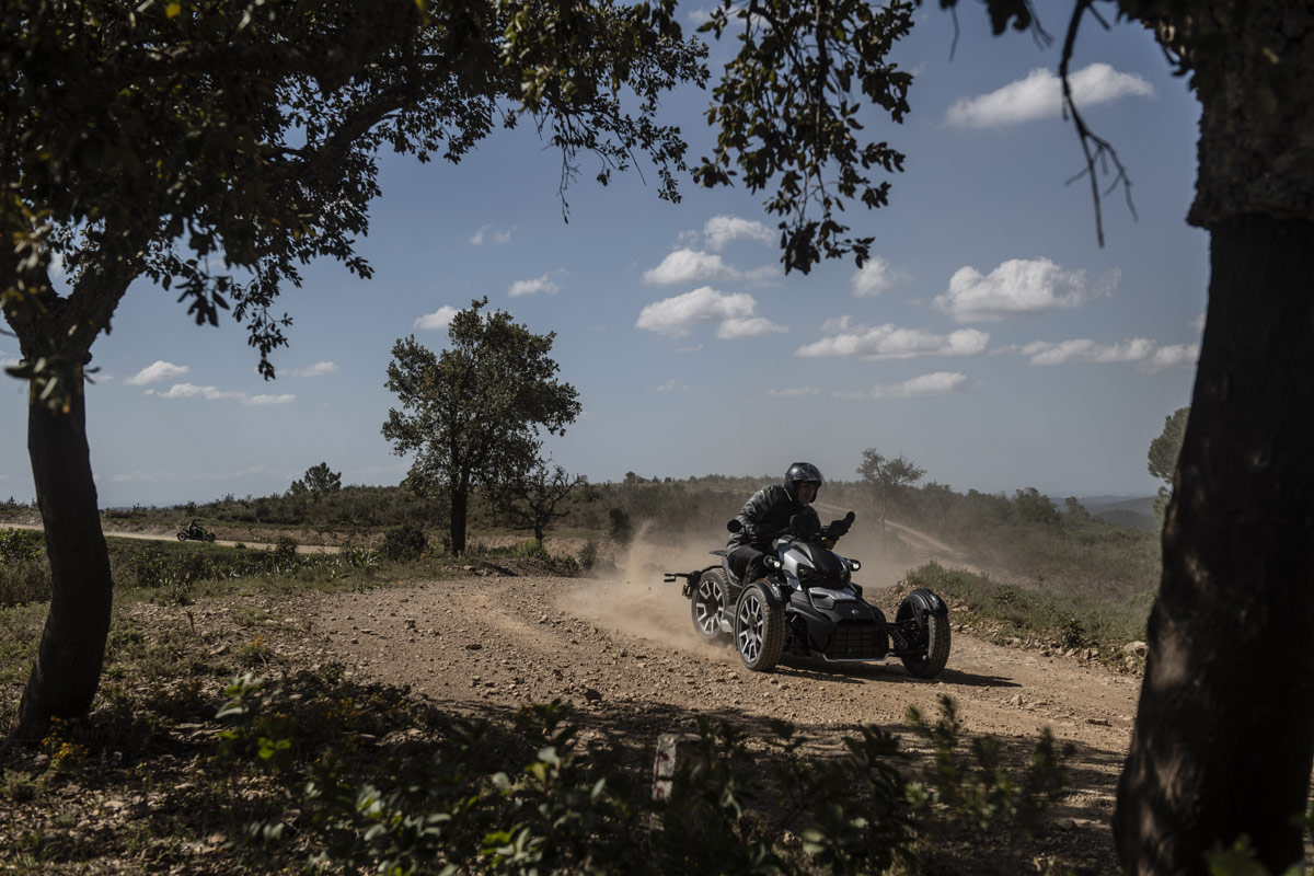 Und genau da beginnt der Spaß! Der Ryker liebt unbefestigte Straßen, wie sie es speziell in Südeuropa noch zu Hauf gibt, Bis 50 km/h lässt die Traktionskontrolle in Zusammenarbeit mit dem ESP dann nämlich phänomenale Driftwinkel zu, die ganz sanft bei Übermut wieder eingefangen werden. Das Fahrwerkssetup harmoniert wunderbar mit dem ABS. Etwa dann, wenn man über kurze Bodenwellen die nächste Kurve anbremsen will. Aber hier spielt der reine Speed sowieso kein Rolle, sondern der Staub auf Deinen Zähnen. Wie der da hinkommt? Vom Grinsen, wenn man leicht die Bremse drückt und Vollgas gibt, bis man mit viel Schlupf eine riesige Staubwolke um sich aufbaut und hinter sich herzieht. Eat my dust!
