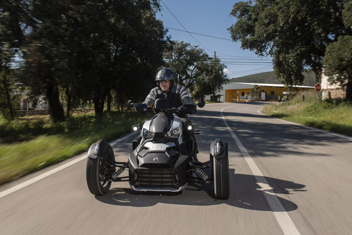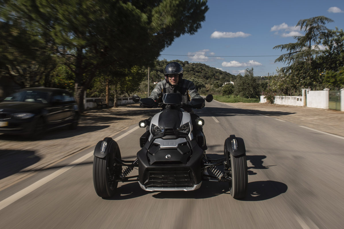 Und wie fährt der Ryker jetzt? Auf Asphalt im Portugiesischen Hinterland durchaus manierlich. Man fühlt sich in der Regel deutlich schneller, als man ist. Meint der Ryker aber, man ist beim Kurvenwedeln doch zu schnell, holt einen das serienmäßige ESP sanft aber bestimmt wieder auf den Pfad der Tugend zurück. Das wirkt alles schon sehr sicherheitsbetont, macht aber durchaus bei einer Tagestour Laune. Es dürfen eben nur keine lästigen Zweispurfahrzeuge vor einem herumdümpeln. Denn beim Überholen steht sich der Ryker nicht nur mit seiner Breite selbst im Weg, sondern auch mit seinem Antriebskonzept. Bei gemäßigtem Landstraßentempo lässt das CVT Getriebe den Dreizylinder einfach nicht schnell genug in den Drehzahlbereich drehen, wo er richtig Bums hat – bei rund 6.500 U/min. So verhungert man im mittleren Drehzahlbereich ein wenig, schert wieder ein und flucht innerlich, dass das mit einem gleichstarken Mopped nicht passiert wäre. Doch den Ryker dafür als undynamisch abzuwatschen wäre jetzt zu hart, denn da gibt es ja noch den Rally Modus, den man im Cockpit per Knopfdruck aktivieren kann.