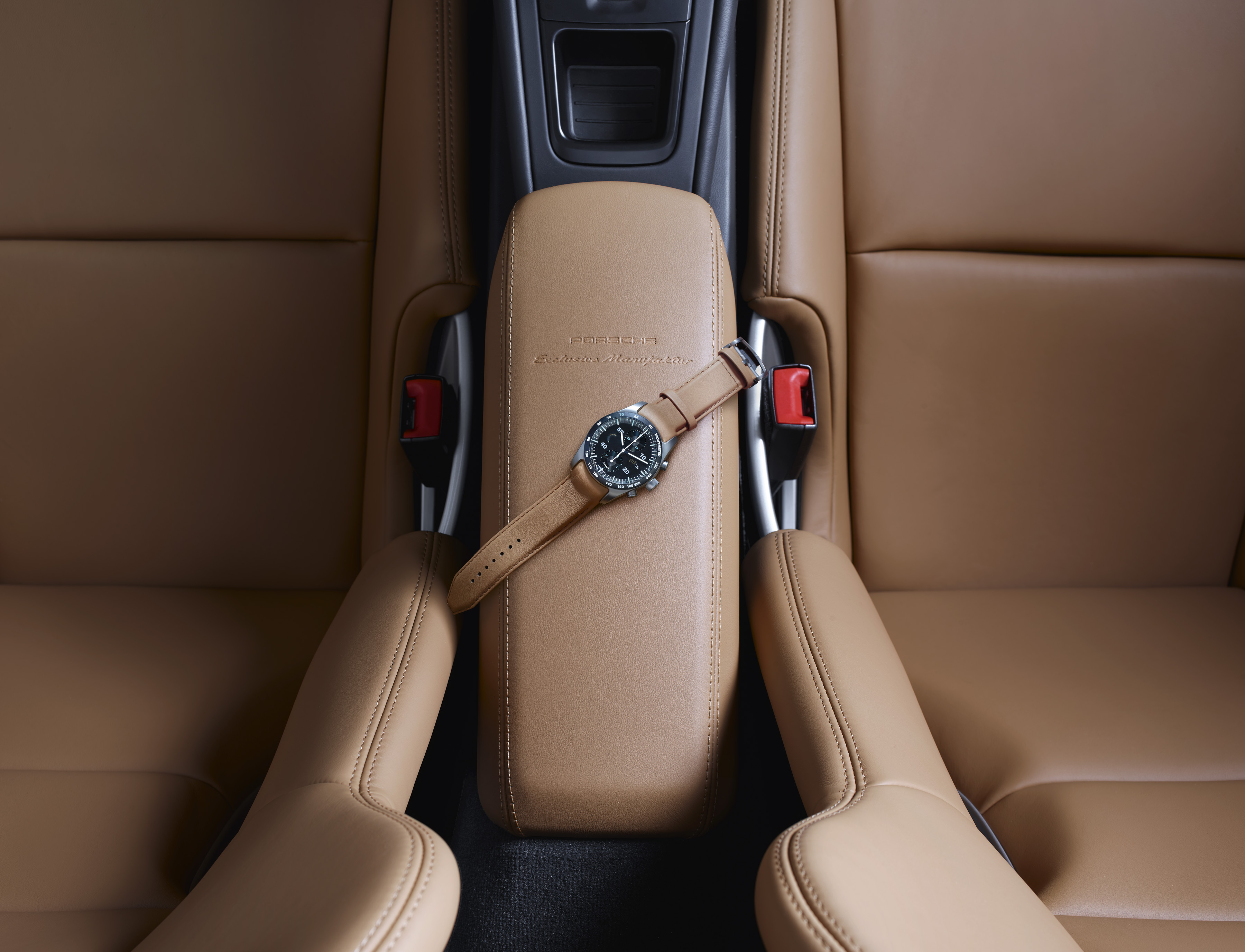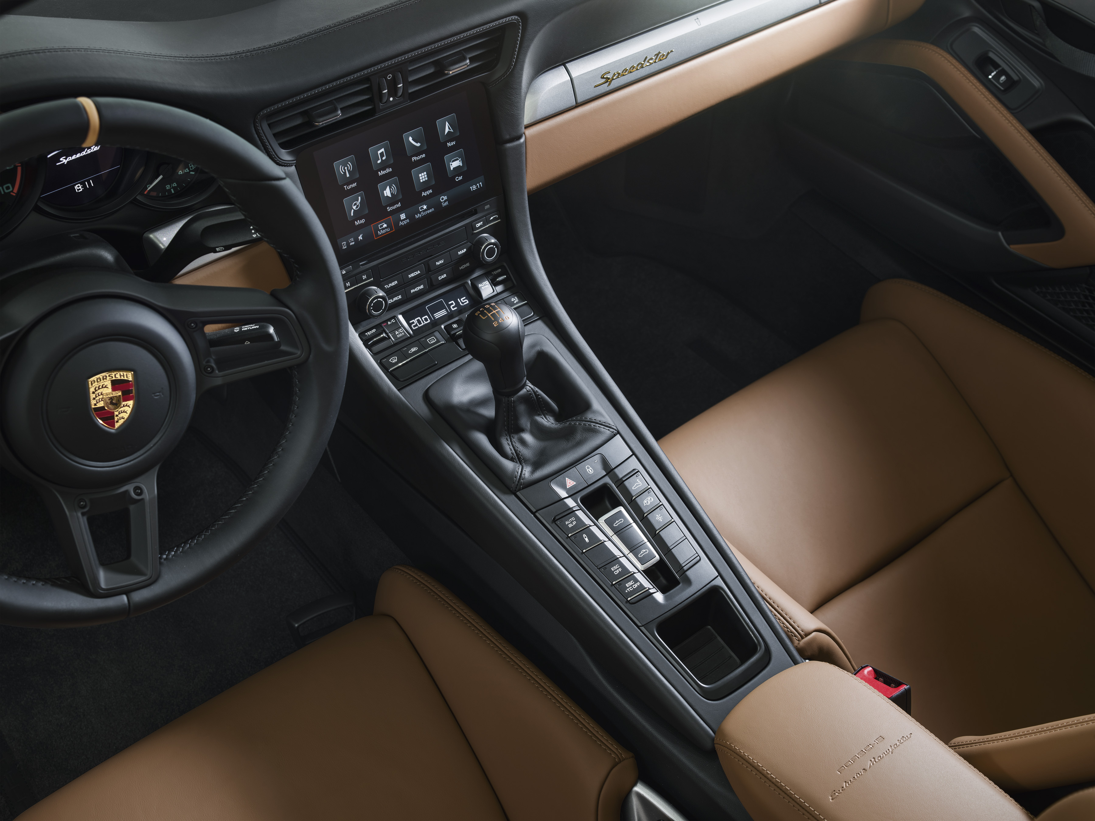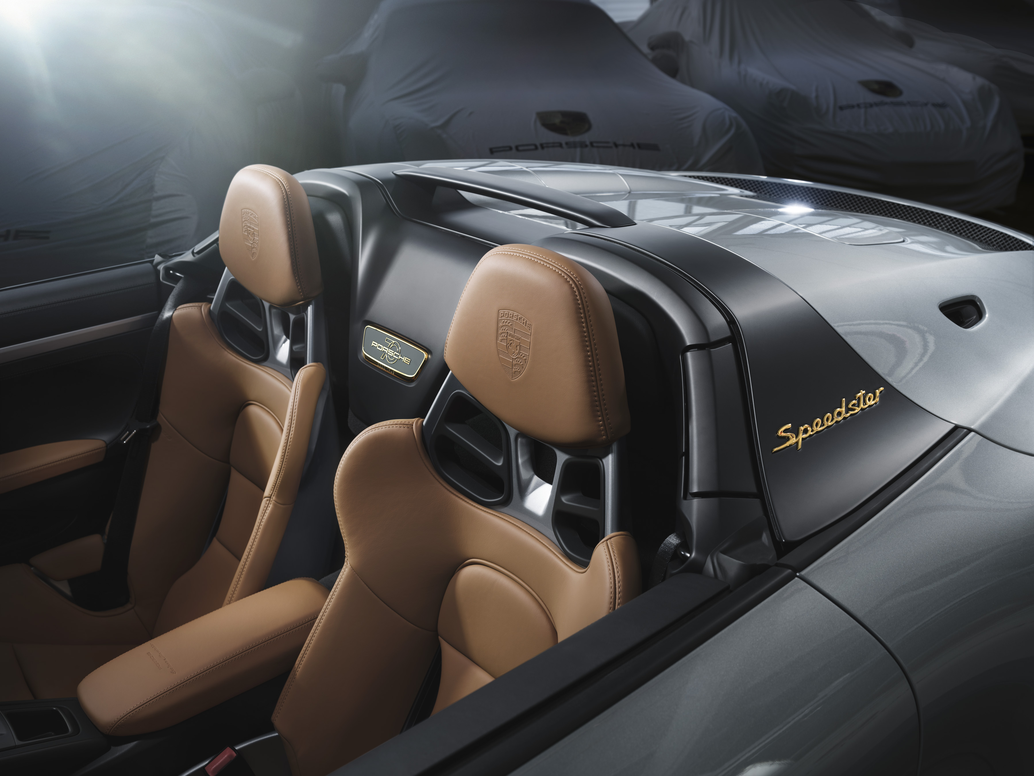 Schriftzüge sind sowieso ein gutes Stichwort: Alle „Speedster“-Nennungen am Fahrzeug sind in goldener Farbe ausgeführt, ganz wie damals in den 50ern. Das gilt ebenso für die Sondermodell-Plakette zwischen den Sitzen. Auch das Interieur stimmt farblich mit der Generation-356 überein. Cognac wohin man schaut. Die Carbon-Schalensitze sind damit bezogen – ihre Rückseiten sind GT-Silbermetallic lackiert – und die Mittenmarkierung auf dem Lenkrad.