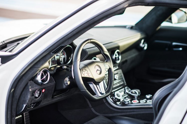 {adsense}Im grünen Bereich? Himmel. Ein SLS ist so grün, wie die katholische Kirche modern. Elektroantrieb hin oder her. Sollte sich das frühe Aufstehen also nicht gelohnt haben? Doch der Blick unter die Haube eines der in der Box parkenden SLS-Flügels ließ uns aufatmen. Denn dort stand schwarz auf silber „handcrafted by Thomas Schiller, Affalterbach, Germany.“ Glück gehabt. Der 6,2-Liter-V8 lebt. Und wie! Stärker denn je, im Black Series SLS nun 631 PS und 635 Nm stark, drehzahlfest bis 8000 Umdrehungen und in der Lage, das Coupé in 3,6 Sekunden von null auf 100 km/h zu drücken. Bei 315 km/h ist Schluss (was wohl an der etwas ausladenden Verspoilerung liegt – aber ein Black ist eben ein Black).
