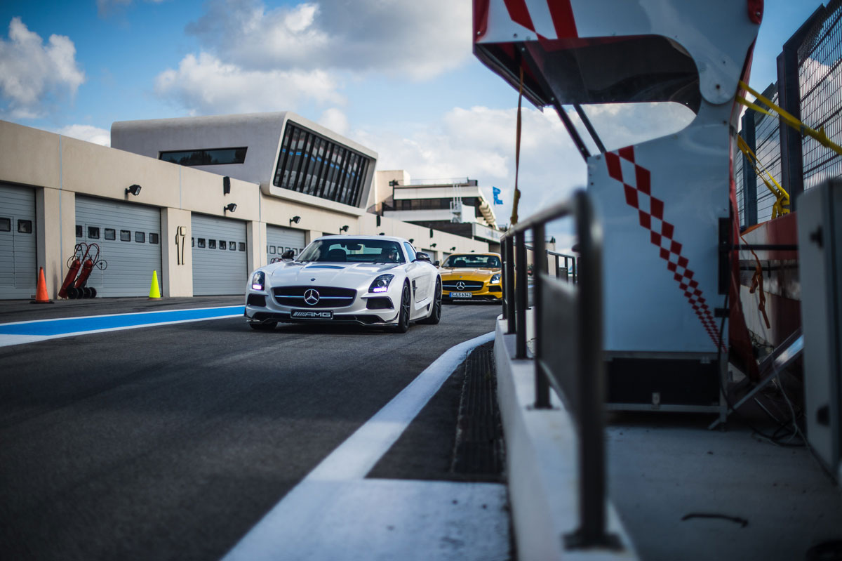 Es gibt diese Tage, an denen reißt es Dich vor lauter Vorfreude schon weit vor dem Weckerklingeln aus dem Bett. Vor einer Woche war es wieder soweit. Mercedes präsentierte die neuen Modelle des SLS. Auf der Rennstrecke. Und dann stehst Du so an der Boxenmauer mit dem Blick über eine der schönsten Rennstrecken der Welt mit ihren blau und rot markierten Auslaufzonen und siehst den neongelben Wahnsinn auf die zufliegen. Beim Anbremsen taucht er auf der Vorderachse kurz ab, lenkt ein und zieht wieder auf die Gerade und aus dem Blick.