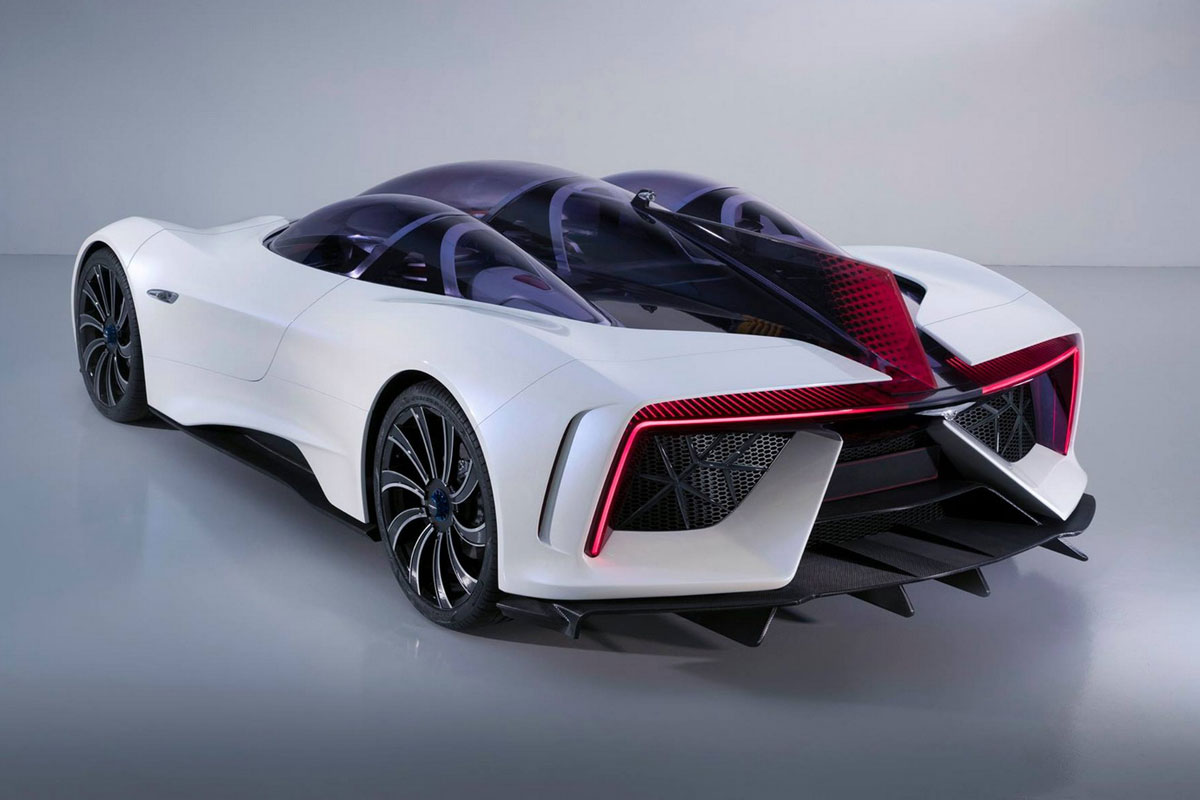 Das Design des Ren – und zwar innen wie außen – wurde vom Flugzeugbau inspiriert, die Karosserie besteht komplett aus Carbon. So soll das Kampfgewicht auf 1.700 Kg gedrückt werden. Was? 1,7 Tonnen sind immer noch viel? Das stimmt, aber im Verhältnis zur verwendeten Technik, relativiert sich das auch wieder. Denn im Heck des Ren arbeiten bis zu drei Turbinen, die bei optimaler Energieausbeute den Strom für die bis zu sechs (!!!) Elektromotoren im Ren produzieren. Zwei Motoren treiben die Vorderachse an, vier weitere kümmern sich um die Hinterachse. In der Summe sollen so 1.303 PS bzw. 2.340 Nm Drehmoment anliegen. Diese Power soll für eine Beschleunigung von 2,5 Sekunden auf Tempo 100 sorgen, der Einsatz der Turbinen soll eine Reichweite von bis zu 1.200 Km ermöglichen.