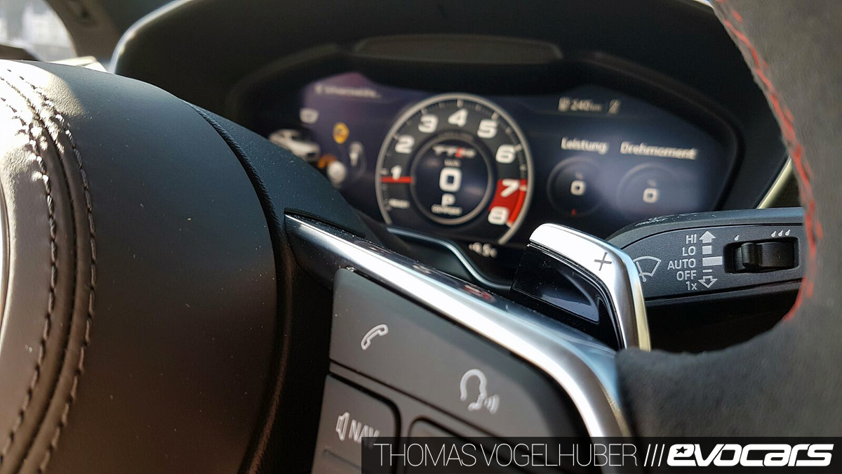 Auch die Verarbeitungsqualität ist gewohnt auf hohem Niveau. Wenngleich wir uns natürlich fragen, warum man bei diesem Fahrzeugpreis große Plastikflächen – wie etwas das Armaturenbrett – nicht etwas schöner gestaltet hat. Die Aufpreisliste im TT RS ist übersichtlich aber knackig. Als da wären zum Beispiel: RS-Sportabgasanlage 850 Euro; Anhebung der Vmax auf 280 Km/h 1.500 Euro; RS Sportfahrwerk Plus 900 Euro und eine Bang & Olufsen Anlage für 850 Euro. Letztere kann man sich getrost schenken. Zum einen, weil man in diesem Wagen sowieso anderes vor hat, als Mozart zu hören – und zum anderen: weil die Anlage eine (im Vergleich zum aktuellen A3) eher magere Soundausbeute liefert. Optisch ein Muss: OLED-Rückleuchten, die unser TT RS leider nicht verbaut hat. Warum? Konnte uns niemand erklären. Ein Blick auf die wenigen Gebrauchten im Netz zeigt aber: entweder wussten selbst die Jungs bei Audi nicht, dass es OLED-Rückleuchten zu bestellen gibt, oder es hat schlicht und ergreifend niemanden interessiert.