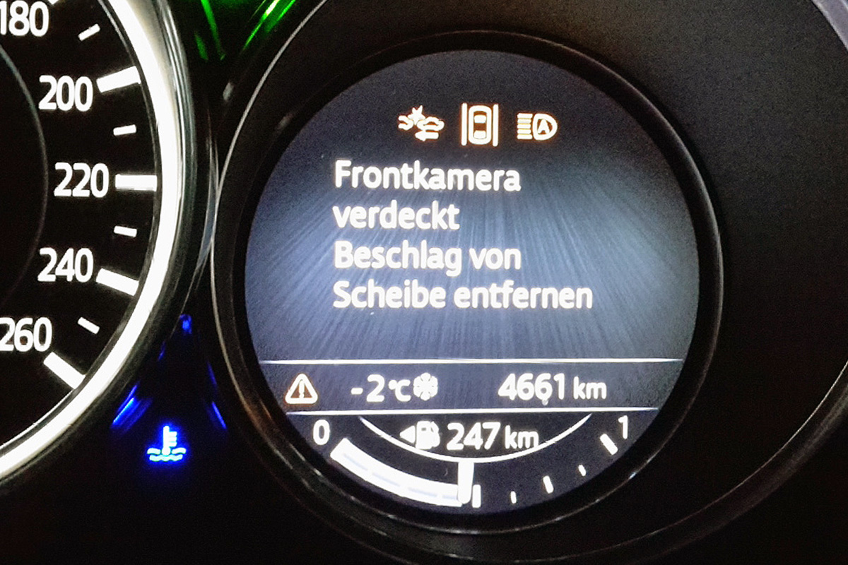 Ebenfalls ärgerlich: Bereits bei leichtem Frost neigen die Assistenzsysteme des Mazdas zu zeitweiligen Aussetzern – verkündet durch wildes Blinken des Kombiinstruments. Das PDC hinten verstummte sogleich komplett – gut, dass der Wagen noch eine Rückfahrkamera an Bord hat. Diese arbeitete zu jeder Tag- und Nachtzeit einwandfrei.