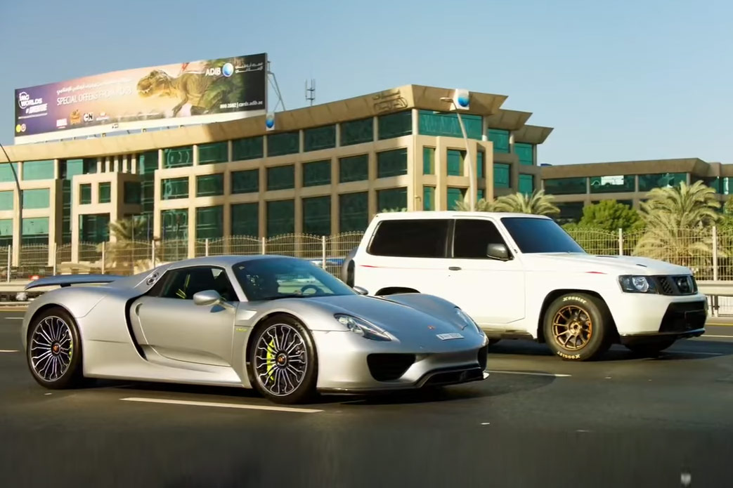 {1}Die Jungs von The Grand Tour haben dem Porsche 918 Spyder einen vermeintlich überlegenen und einen vermeintlich deutlich unterlegenen Kontrahenten zur Seite gestellt. Zunächst muss sich der Porsche gegen den deutlich stärkeren Bugatti Veyron beweisen, dann soll er einen getunten Nissan Patrol in seine Schranken weisen. Doch der Ausgang der Duelle ist anders, als vom Zuschauer zu erwarten gewesen wäre. Doch seht selbst!