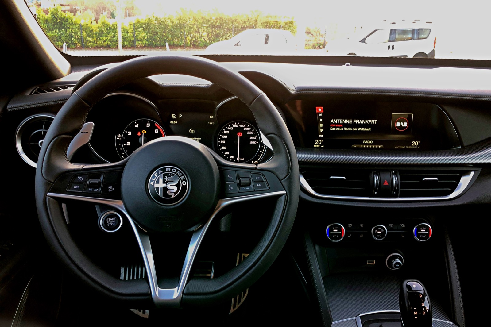 Die Wirkungsweise des Vierzylinders können wir getrost mit „unauffällig“ beschreiben, hält er sich doch gerade auf der Autobahn gen Süden dezent im Hintergrund. In Kombination mit der Automatik gibt das alles ein harmonisches Bild ab, im Normalmodus wird zügig und ruckfrei hochgeschaltet, bei Bedarf reagiert das Getriebe aber spontan auf Gas- und Schaltbefehle. Weniger dezent fiel der Spritkonsum auf, der selbst unter sparsamer Fahrweise und teilweiser Verwendung des Spritsparmodus’ (der dank seiner Leistungsreduktion wirklich keinen Fahrspaß bereitet) kaum weniger als neun Liter je 100 Kilometer betrug. Im Mittel bewegten wir den Stelvio auf der Langstrecke mit sportlichem Betrieb auf der Landstraße sowie wenig Stadtverkehr mit 9,5 Litern pro 100 Kilometer.