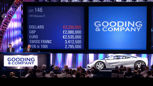 Der weit größere Hammer war aber nicht die RM Auktion, sondern das, was sich bei Gooding & Company abgespielt hat. Dort stand ein straßenzugelassener McLaren F1 zum Gebot. Chassisnummer 66, unschuldig silber lackiert. Gut, erste Hand, volles Serviceheft im Werk und gerade 12.000 Meilen auf dem Tacho. Aber warum in aller Welt für ein 16 Jahre altes Auto, von dem es noch knapp 100 Stück gibt 8,67 Millionen Dollar zahlen? Vor zwei Jahren gab es den Dreisitzer für nicht einmal die Hälfte! Einzige Erklärung: Hier hat sich ein wirklich blühender Verehrer von Larry Ellison – dem Besitzer von Oracle und eben diesem McLaren F1 – einen Lebenstraum erfüllt.