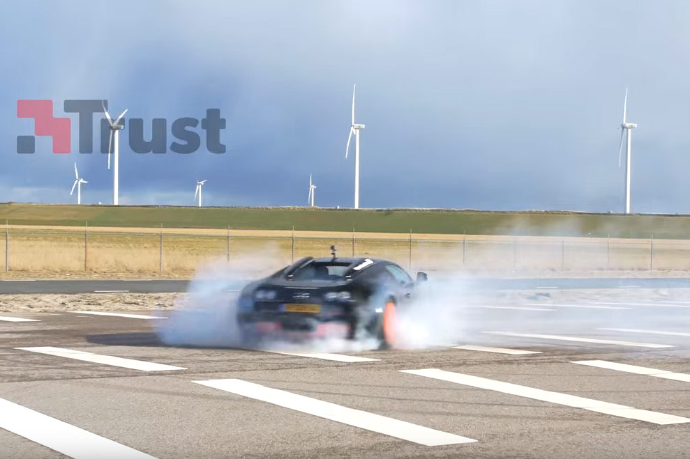 So sieht das also aus, wenn ein 1.200 PS starker und weit über eine Million Euro teurer Bugatti Veyron Grand Sport Vitesse die Sau rauslässt und die schweineteure 430-km/h-Bereifung malträtiert. Nun ja, der Fahrer wird schon wissen, was er tut. Warum der aufgeregte Beifahrer aber immer seine Hand vor den Mund hält, leuchtet mir nicht so recht ein.