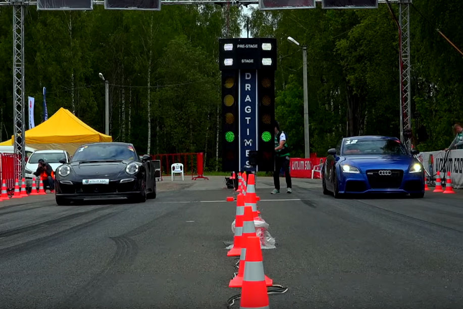 Statt der serienmäßigen 560 PS bringt es der Boxer im Heck dieses Porsche 911 Turbo S (991) auf immerhin 650 PS. Man meint, dass sollte locker reichen, um einen Audi TT RS zu knacken – auch wenn dieser mit 600 PS im Futter steht. Allradantrieb haben zwar beide, aber der Porsche bringt fast 200 Kilogramm mehr auf die Waage. Also, wie geht das Duell aus?