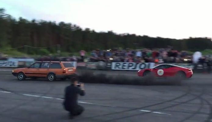 Das ist schon hart, wenn man in einem Ferrari 458 Italia mit 570 PS von einem uralten VW Passat Variant 32B Diesel abgezogen wird. Sicher, der VW ist kein Serienmodell, aber zumindest optisch sind keine großen Veränderungen auszumachen, selbst die Bereifung scheint zumindest ansatzweise hinzukommen.