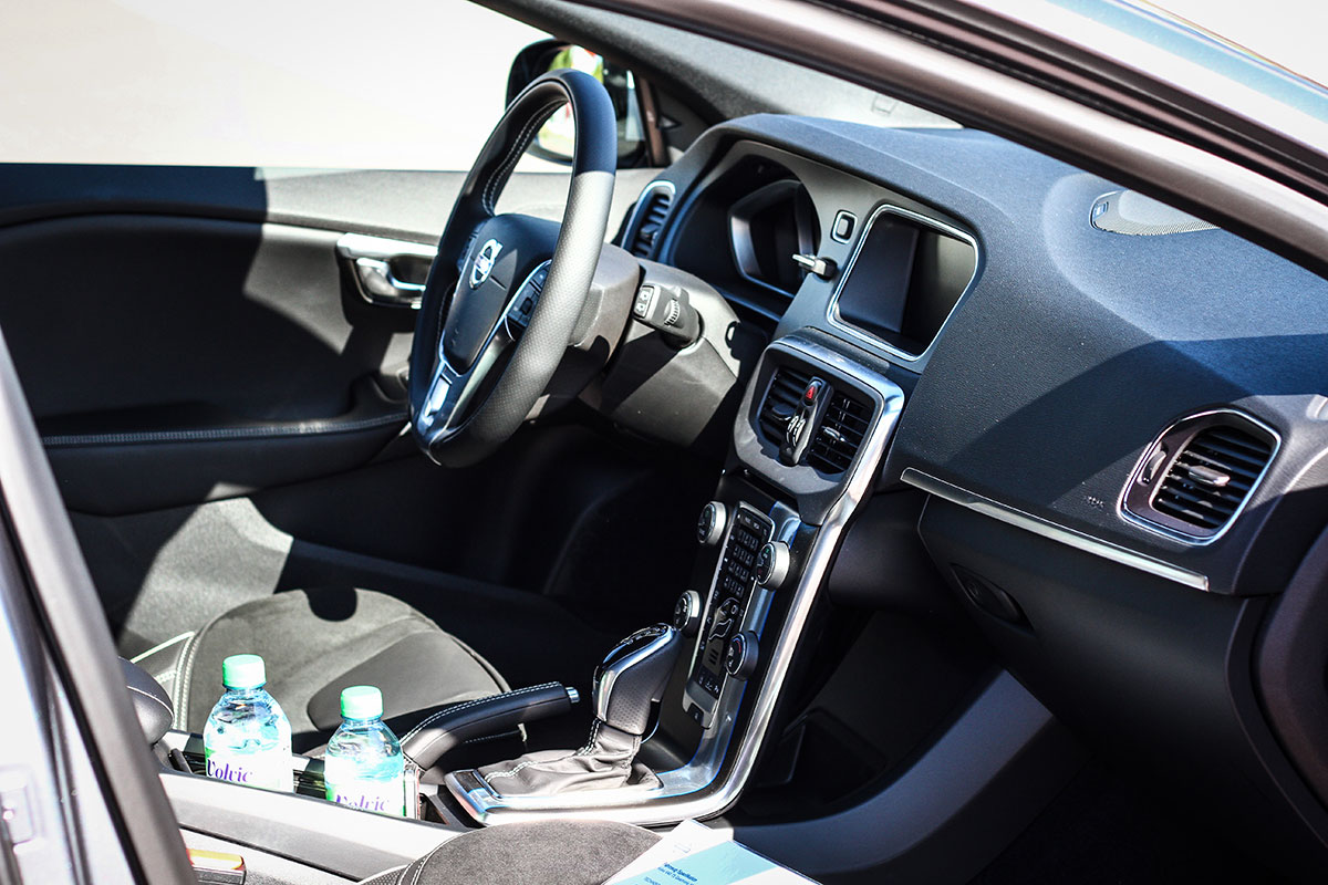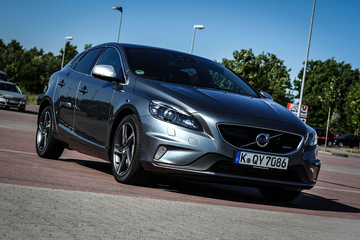 Volvo-V40-T5-(5)Äußerlich gibt sich der V40 trotz „R-Design“-Paket recht zurückhaltend. In „Osmium-Grau-Metallic“ und mit den relativ klein wirkenden Felgen würde man Ihm die 245 PS nicht auf den ersten Blick zutrauen – und auch auf den zweiten eigentlich nicht. Panoramaglasdach, Businesspaket und Sitzheizung, alles mit drin. Die Sitze aus schwarzem Leder und Alcantara bieten einen guten Seitenhalt, das R-Design-Lenkrad einen guten Anpack. Generell ist der V40 ausgezeichnet verarbeitet, die Haptik ist auf sehr hohem Niveau.