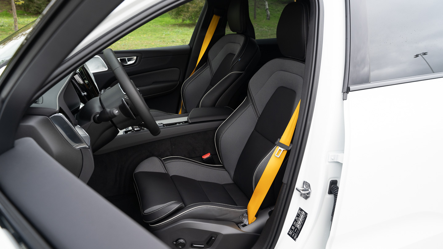 {1}Auch im Innenraum bleibt der Polestar zurückhaltend. Die Einrichtung mit dem großen Hochkant-Monitor ist ebenso bekannt, wie die sehr gute Ergonomie und die tolle Verarbeitung. Die bequemen und vielfach verstellbaren Sitze sind mit einem griffigen Mix aus Leder und Stoff bezogen. Einzig die gelben Gurte sind eine exklusive Zugabe für den Volvo XC60 Recharge Polestar.