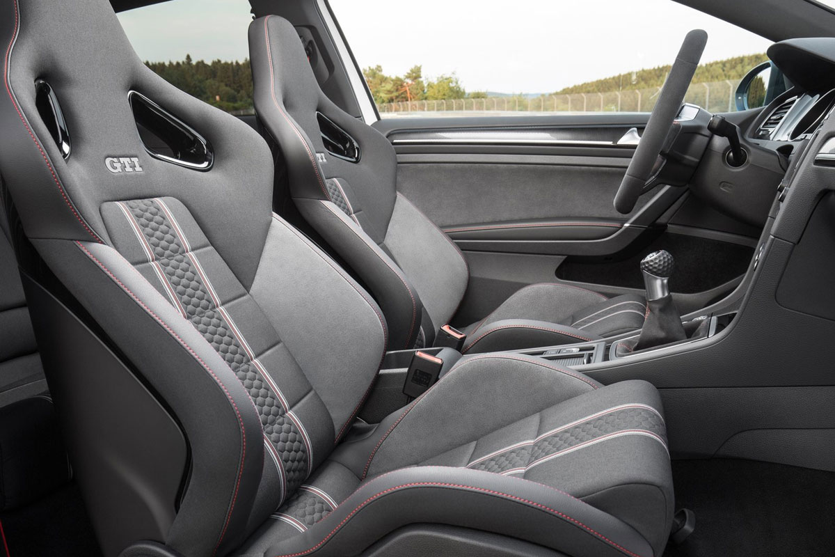 Natürlich hebt sich auch der Innenraum des GTI Clubsport von den zahmeren Brüdern mit 220 PS bzw. 230 PS ab. Hier kommen spezielle Sportsitze und einiges an Zierrat zum Einsatz – rote Linie auf den Sicherheitsgurten, GTI-Schriftzug in den Rückenlehnen etc.