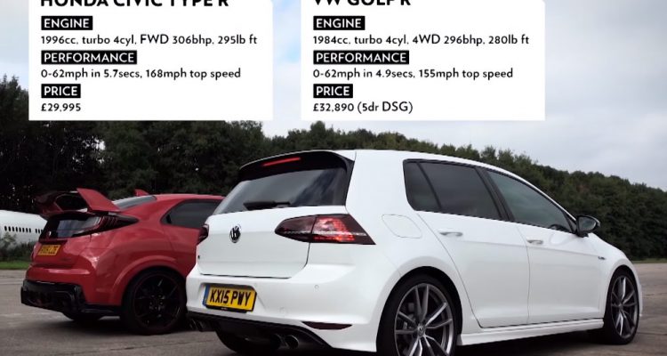 {1}Zumindest auf dem Papier hat der neue Honda Civic Type R die Nase vor dem VW Golf R. Der Zweiliter-Turbobenziner im Honda gibt seine 310 PS bei 6.500 U/min ab. Das maximale Drehmoment von 400 Nm liegt bei 2.500 U/min an. Geschaltet wird über eine manuelle Sechsgang-Box, angetrieben werden die Vorderräder. Und eben die beiden letztgenannten Punkte könnten dem allradgetriebenen VW Golf (2.0 TSI, 300 PS, 380 Nm) mit seinem Doppelkupplungsgetriebe den entscheidenden Vorteil liefern. Ob dem wirklich so ist, haben die Jungs von TopGear in einem Dragrace getestet. Das Ergebnis seht ihr im Video oben. Ach ja: Mit einem Einstiegspreis von 34.750 Euro ist der Honda knapp 4.500 Euro preiswerter als der Golf.