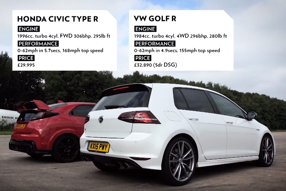 {1}Zumindest auf dem Papier hat der neue Honda Civic Type R die Nase vor dem VW Golf R. Der Zweiliter-Turbobenziner im Honda gibt seine 310 PS bei 6.500 U/min ab. Das maximale Drehmoment von 400 Nm liegt bei 2.500 U/min an. Geschaltet wird über eine manuelle Sechsgang-Box, angetrieben werden die Vorderräder. Und eben die beiden letztgenannten Punkte könnten dem allradgetriebenen VW Golf (2.0 TSI, 300 PS, 380 Nm) mit seinem Doppelkupplungsgetriebe den entscheidenden Vorteil liefern. Ob dem wirklich so ist, haben die Jungs von TopGear in einem Dragrace getestet. Das Ergebnis seht ihr im Video oben. Ach ja: Mit einem Einstiegspreis von 34.750 Euro ist der Honda knapp 4.500 Euro preiswerter als der Golf.