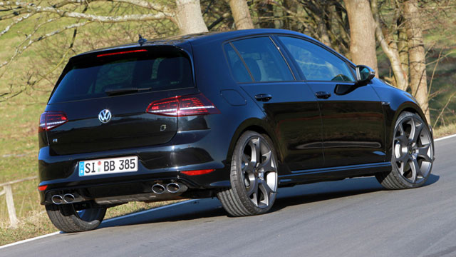 In drei Stufen rückt der Tuner dem TSI unter der Haube zu Leibe. Los geht’s bei 1.298 Euro für 60 PS und 70 Newtonmeter mehr – erreicht durch eine neue Steuersoftware (mehr Ladedruck). Bei Stufe zwei für 3.950 Euro liegt die Ausbeute bei insgesamt 385 PS und 480 Newtonmeter Drehmoment. Mittel zum Zweck sind auch eine neue Steuersoftware mit mehr Ladedruck (0,25 bar) sowie ergänzend eine neue Abgasanlage mit Sportkats und größeren Rohrdurchmessern. Nach dem Eingriff soll der Golf R von B&B in 4,5 Sekunden auf Tempo 100 kmmen, bis 200 km/h dauert es nur 17,5 Sekunden. Damit nimmt der getunte Hot Hatch dem Serienmodelle XXX beziehungsweise knapp 2,0 Sekunden ab. Wie schnell der 385 PS starke Kompaktwagen wird, wird nicht kommuniziert.
