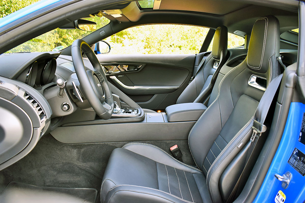 Gleichermaßen beeindruckend ist normalerweise auch das von ZF bereitgestellte 8HP-Getriebe, welches nicht nur bei Jaguar Land Rover gerne genutzt wird. Es schaltet in der Regel sehr direkt, butterweich und ohne merklichen Zugkraftverlust. Auch im F-Type ist es weitestgehend eine Wucht, wäre da nicht der kleine Makel der etwas zu nervösen Getriebeprogrammierung. Zu oft schaltet der 8-Gang-Wandler ein oder zwei Gänge zurück, obwohl das Gaspedal nur minimal gedrückt wird. Gerade auf der Autobahn ist man daher geneigt dem Jaguar manuell den richtigen Gang zuzuweisen. Die optionale Bremsanlage (vorne 380, hinten 376 Millimeter im Durchmesser) packt dagegen kraftvoll zu, verzögert standesgemäß und auch aus höheren Geschwindigkeiten mehr als nachhaltig. Ein paar Worte noch zum Spritverbrauch: Bei Bedarf geht der F-Type mit seinen 70 Litern im Tank recht sparsam um, lassen sich selbst Verbräuche mit einer acht vor dem Komma ohne Schwierigkeiten realisieren. Im normal gefahrenen Schnitt sind es dann aber eher 11-12 Liter Benzin die man einplanen muss – schließlich will man seinen Jag auch einmal herausfordern.