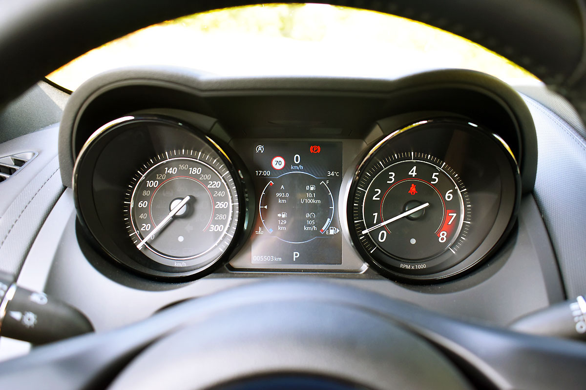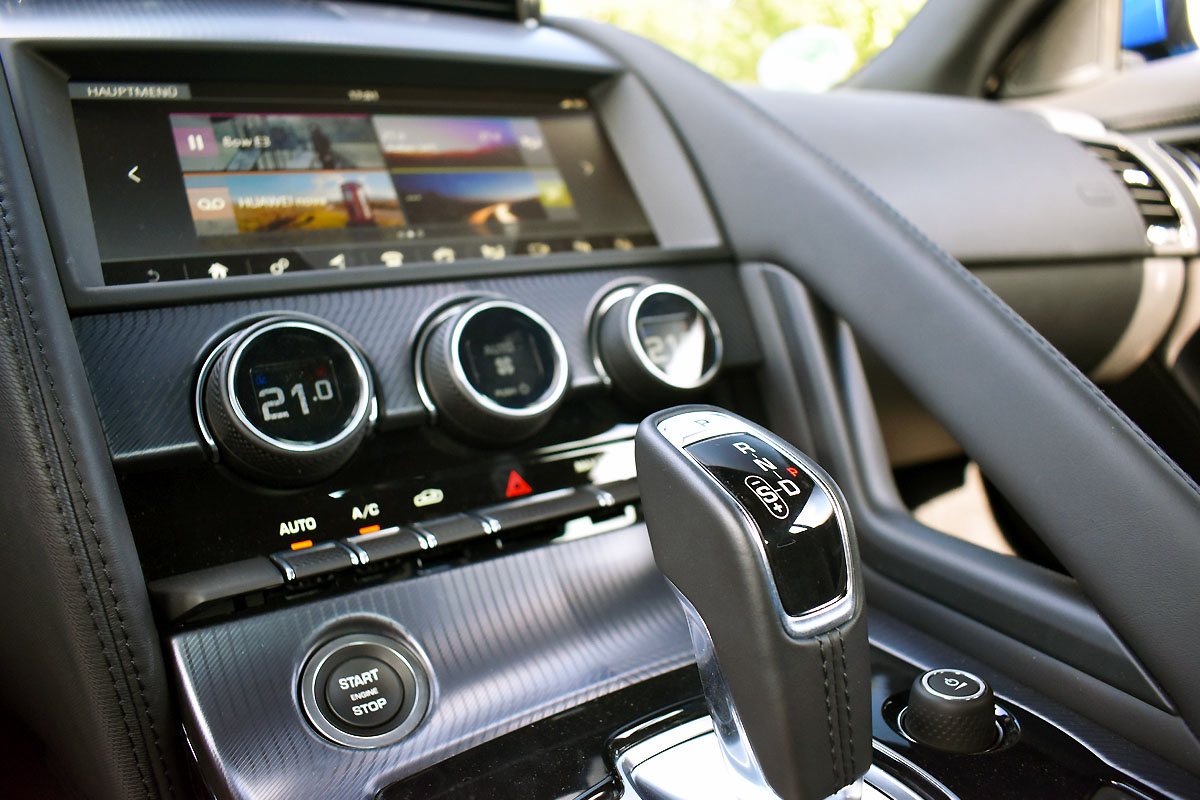 Wer gerne viel und schnell fährt, der freut sich natürlich auch über ein entsprechendes Ambiente im Innenraum. Eng aber nicht knapp bemessen geht es im F-Type zu, das Interieur, samt der perfekt sitzenden aber optionalen Performance-Sportsitze, passt auch für größer gewachsene Fahrer und Beifahrer wie ein sprichwörtlicher Maßanzug. Der analoge Instrumenteneinsatz samt Bordcomputer ist vorbildlich abzulesen, die Knöpfe und Schalter in der Mittelkonsole sind leicht zu erreichen und das Infotainmentsystem mit seinem großen Touchscreen lässt sich flott und zielgerichtet bedienen. Obwohl das System jenem aus dem aktuellen Ranger Rover (hier bei uns im Test) in weiten Teilen gleicht, lässt es sich im Jaguar insgesamt runder befehligen, was unserer Meinung nach an den kürzeren Bedienwegen und einer anderen Softwareversion (mit größeren Touchfeldern) liegen dürfte.