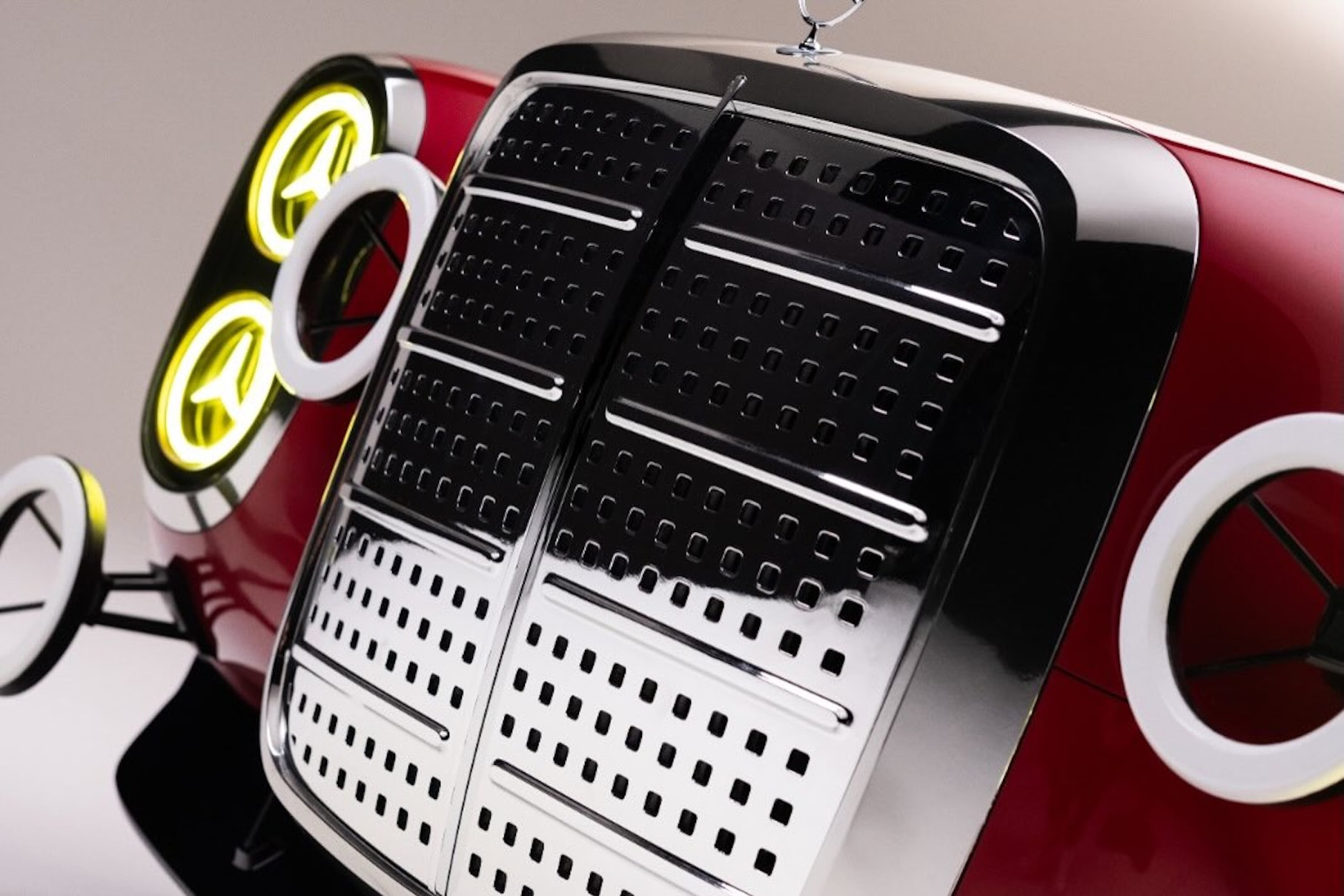Die moderne Interpretation greift gestalterische Elemente aktueller Modelle wie der S-Klasse oder des CLA auf, etwa durch LED-Lichtgrafiken mit Sternmotiv. Zusätzliche Rennscheinwerfer weichen leuchtenden LED-Ringen. Die Lackierung orientiert sich klar am historischen Vorbild, ebenso die markanten Fünfspeichenräder im Stil von 1971.