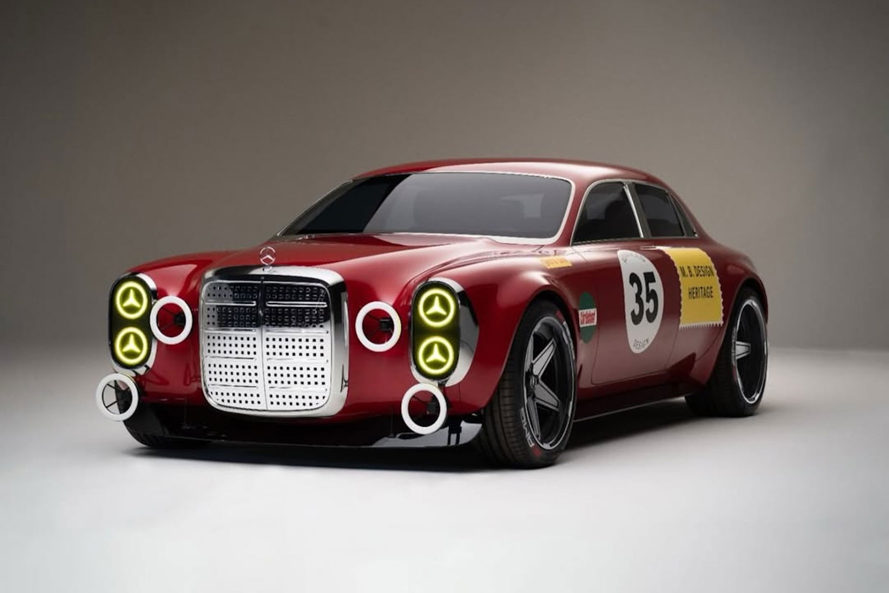 Die moderne Interpretation greift gestalterische Elemente aktueller Modelle wie der S-Klasse oder des CLA auf, etwa durch LED-Lichtgrafiken mit Sternmotiv. Zusätzliche Rennscheinwerfer weichen leuchtenden LED-Ringen. Die Lackierung orientiert sich klar am historischen Vorbild, ebenso die markanten Fünfspeichenräder im Stil von 1971.